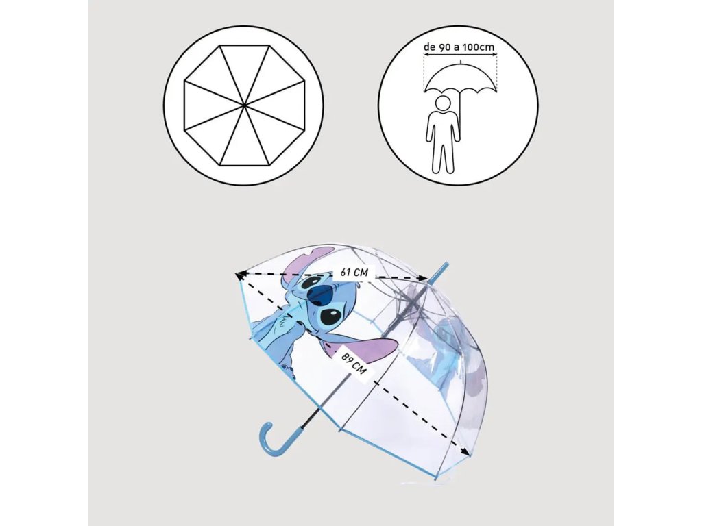 S týmto kúzelným dáždnikom s motívom Lilo & Stitch ťa zlé počasie nerozhodí! Po otvorení má priemer 86 cm, takže ťa bezpečne ukryje pred dažďom, a vďaka priehľadnému materiálu budeš mať perfektný prehľad o okolí. Na dáždniku ťa navyše stráži roztomilý Stitch, ktorý ti spríjemní každý krok. Je ľahký, skladný a pohodlný na nosenie, čo z neho robí ideálny doplnok nielen pre deti, ale aj pre dospelých milovníkov Disney.