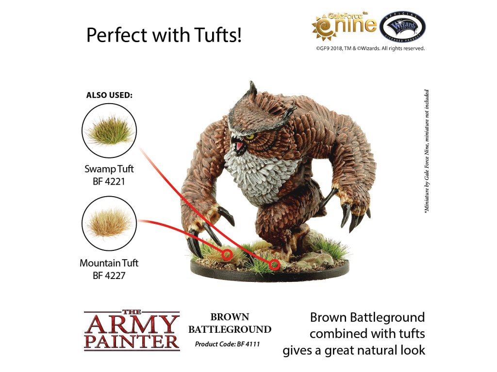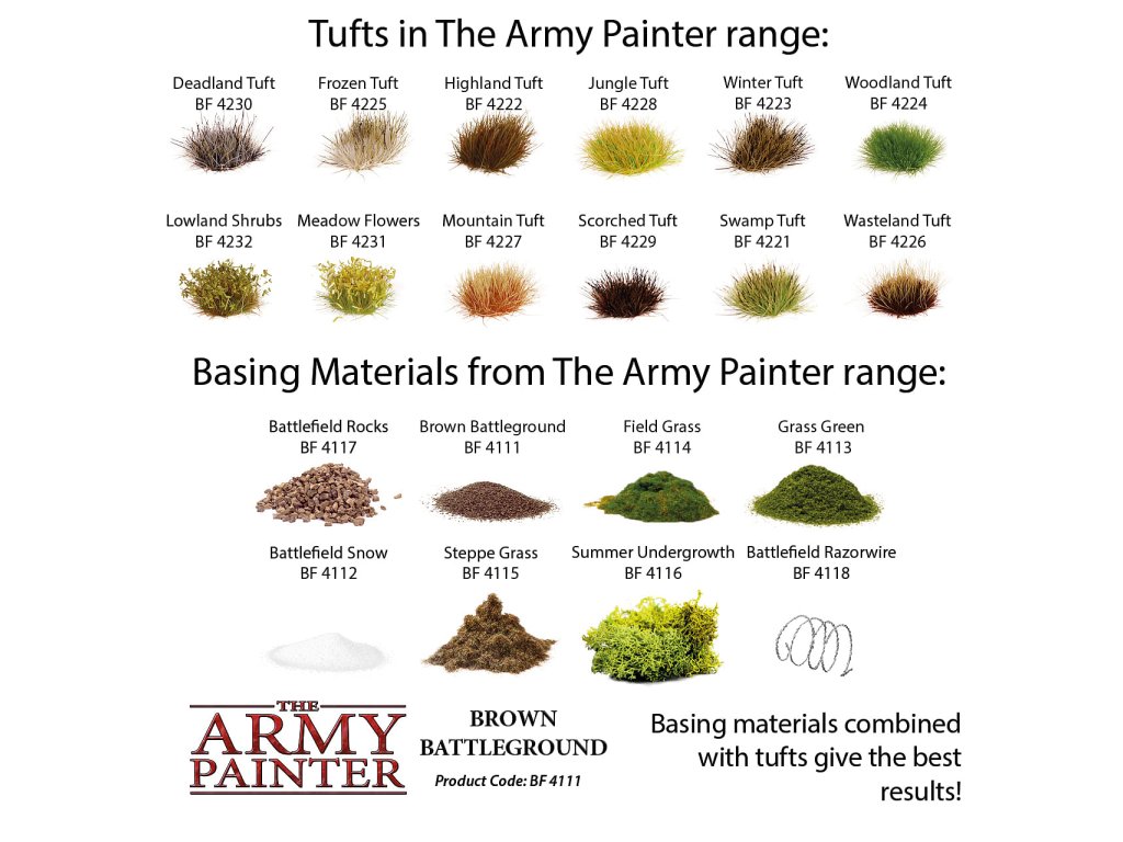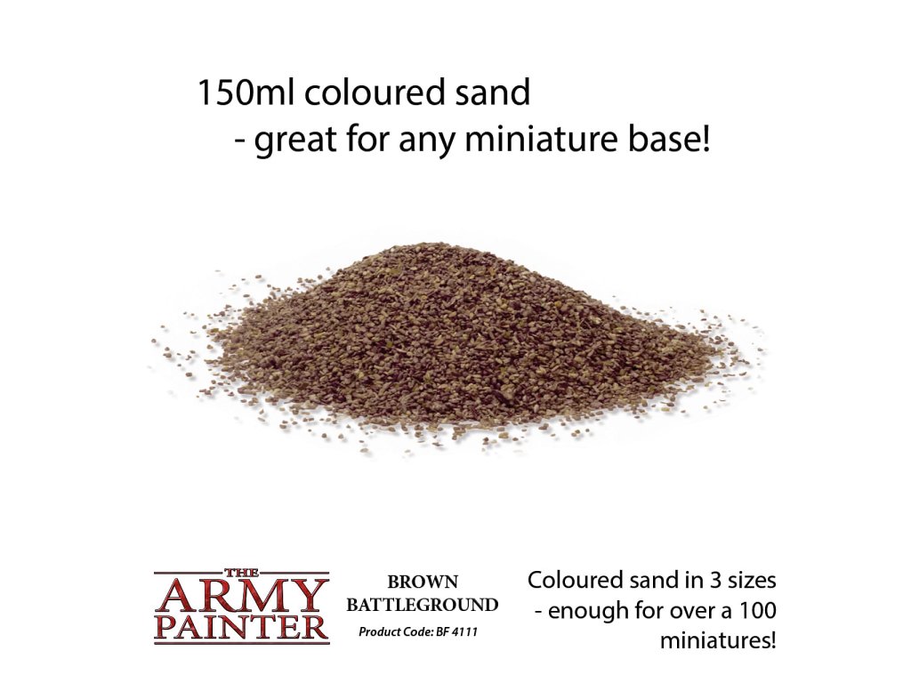 Balenie Brown Battleground obsahuje posyp od spoločnosti Army Painter, ktorý je vhodný na výzdobu podstavcov miniatúr a modelov. Posyp je v troch rôznych veľkostiach, takže je vhodný skutočne pre akýkoľvek typ podstavca. Posyp môže byť farbený na dosiahnutie ďalších efektov, vhodné kombinovať s tuftami Army Painter či ďalším materiálom na vytváranie podstavcov.