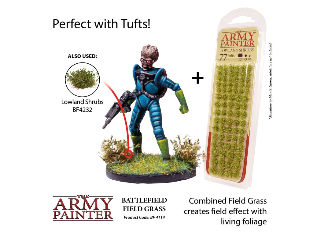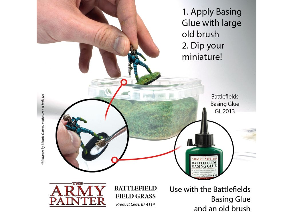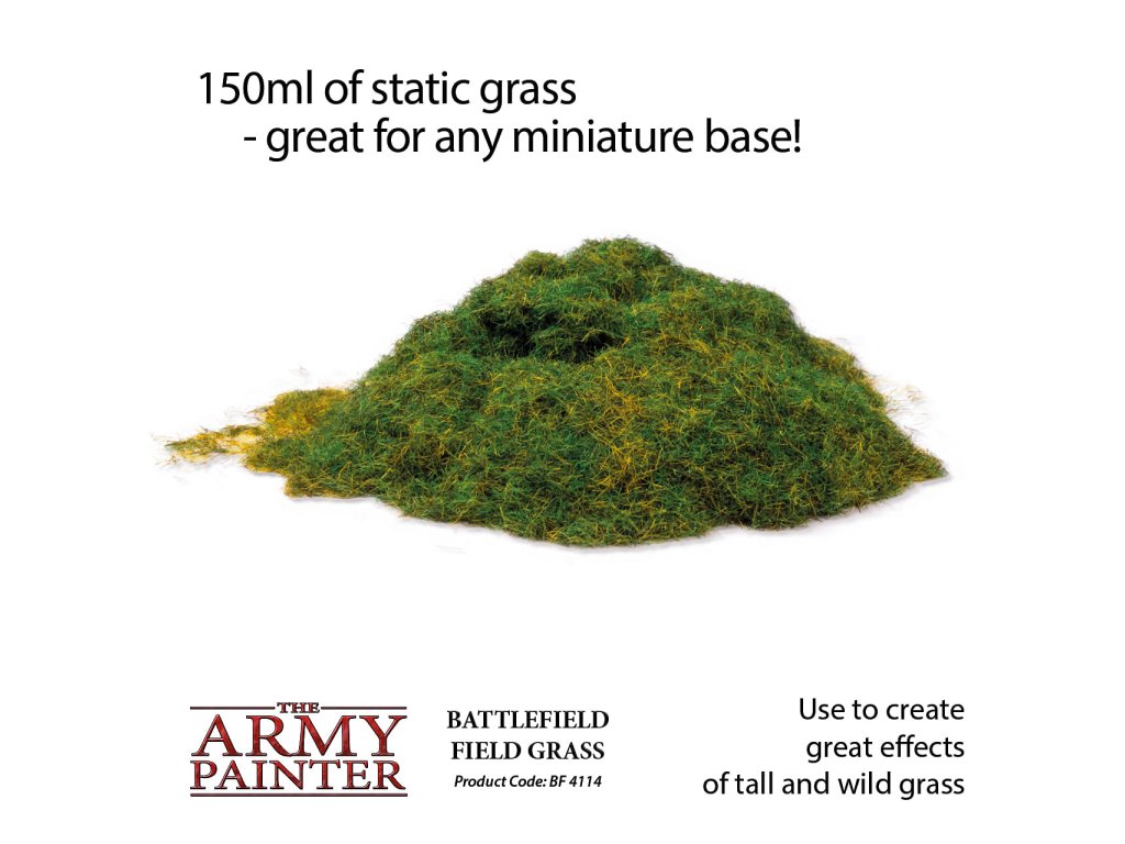 Balenie Field Grass obsahuje posyp od spoločnosti Army Painter, ktorý je vhodný na výzdobu podstavcov miniatúr a modelov. Posyp je v troch rôznych veľkostiach, takže je vhodný skutočne pre akýkoľvek typ podstavca. Posyp môže byť farbený na dosiahnutie ďalších efektov, vhodné kombinovať s tuftami Army Painter či ďalším materiálom na vytváranie podstavcov.