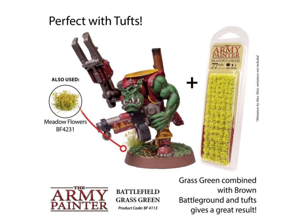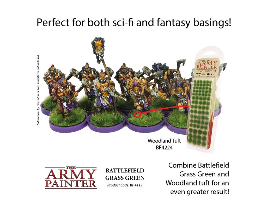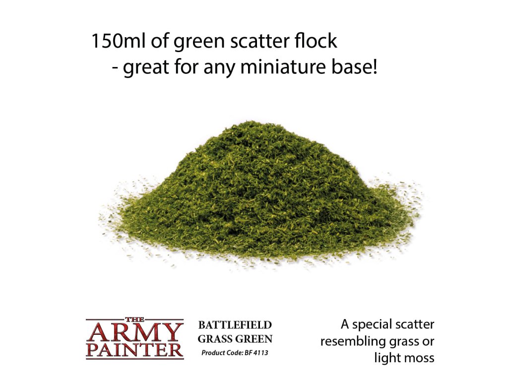 Balenie Grass Green obsahuje posyp od spoločnosti Army Painter, ktorý je vhodný na výzdobu podstavcov miniatúr a modelov. Posyp je v troch rôznych veľkostiach, takže je vhodný skutočne pre akýkoľvek typ podstavca. Posyp môže byť farbený na dosiahnutie ďalších efektov, vhodné kombinovať s tuftami Army Painter či ďalším materiálom na vytváranie podstavcov.