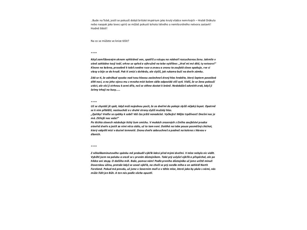 Odhaľte pútavý svet klasickej gotickej hororovej novely od Brama Stokera v úplne novom spracovaní. Drakula: Upírova kliatba je fascinujúci gamebook napísaný skúseným autorom Jonathanom Greenom. Klasická literatúra v modernom poňatí V tejto interaktívnej knihe vkročíte do topánok ikonických postáv, ako je mladý advokát Jonathan Harker, jeho snúbenica Mina Murray, doktor John Seward, alebo dokonca tajomný gróf Drákula sám. Veľmi nad príbehom je vo vašich rukách. Keď robíte rozhodujúce voľby, čelíte hrozbám a staviate sa do cesty nebezpečným nepriateľom. Na tom, či vzídete ako víťazi, alebo padnete za obeť kliatbe upíra, závisí výhradne vaše voľby. Mŕtvi sa pohybujú rýchlo a vaše putovanie týmto temným rozprávaním vás udrží napäté a zaujaté. Herné varianty pre každého Jonathan Green pre tento gamebook zvolil hernú mechaniku, ktorá poteší všetkých čitateľov - od fanúšikov hodu kockou, cez netradičné voľby, až po absenciu akékoľvek hádzanie alebo žrebovanie. Gamebook je možné hrať úplne bez kociek a bude záležať čisto na vašom výbere ďalšieho kroku. Rovnako tak výber postáv umožňuje opakované hranie s zakaždým trochu odlišnými zážitkami. Od skúseného autora Jonathan Green je osobnosťou v oblasti špekulatívneho románu, ktorý sa môže pýšiť portfóliom cez sedemdesiat kníh. Je známy svojimi príspevkami do série Fighting Fantasy adventure gamebooks a jeho pestrá práca zahŕňa univerza ako Pán času, Hviezdne vojny, Warhammer, Ježko Sonic a mnoho ďalšieho. Ako tvorca série Pax Britannia napísal príbehy v rámci steampunkového vesmíru s charizmatickým dobrodruhom Ulyssesom Quicksilverom. V ČR sú k dostaniu jeho gamebooky Alenčina nočná mora v Ríši divov, Nezem: Tu sú príšery a OZ, ktoré pre slovenský trh zabezpečilo nakladateľstvo Mytago. Odkazy Sprievodná listina (pdf) Zaujal ťa tento gamebook? Prečítaj si recenziu na našom blogu.