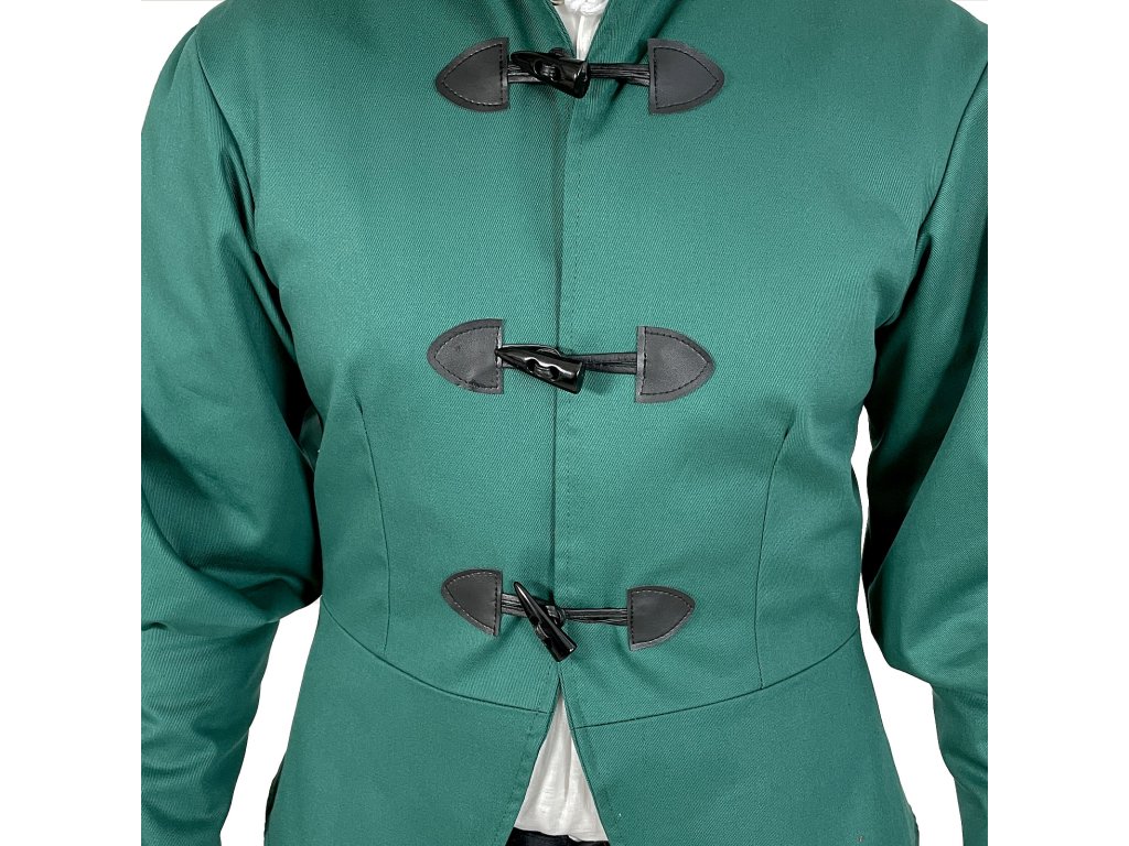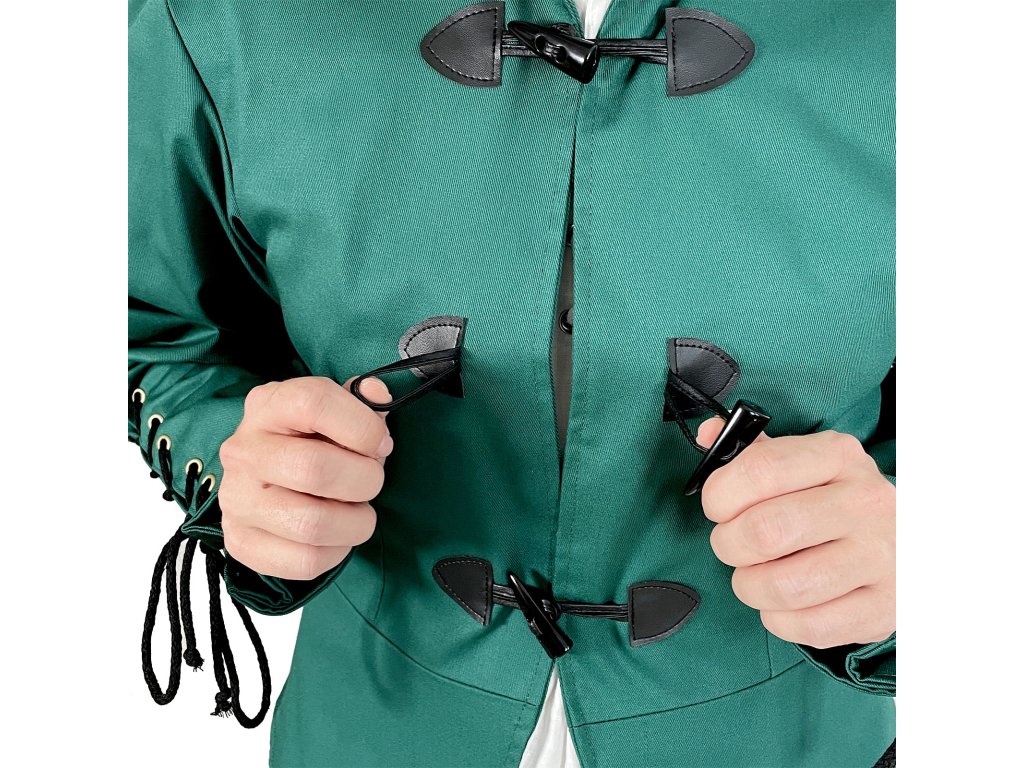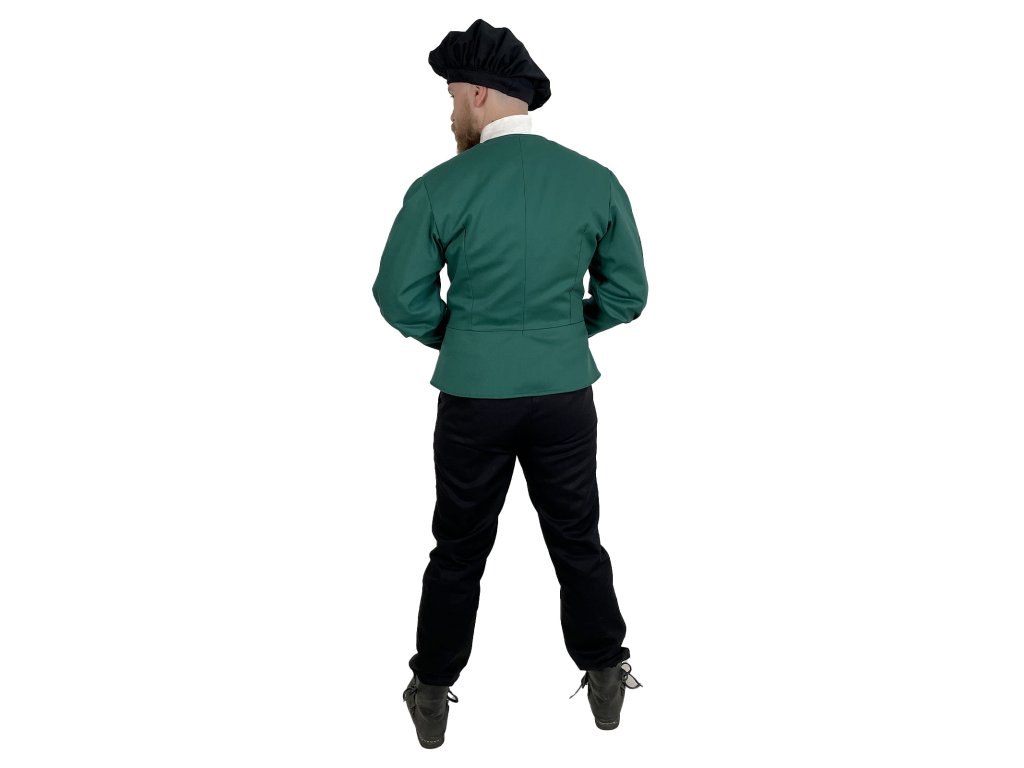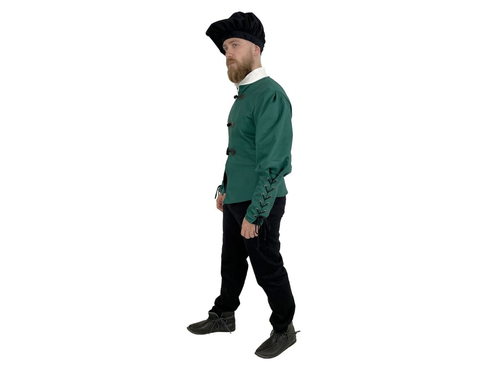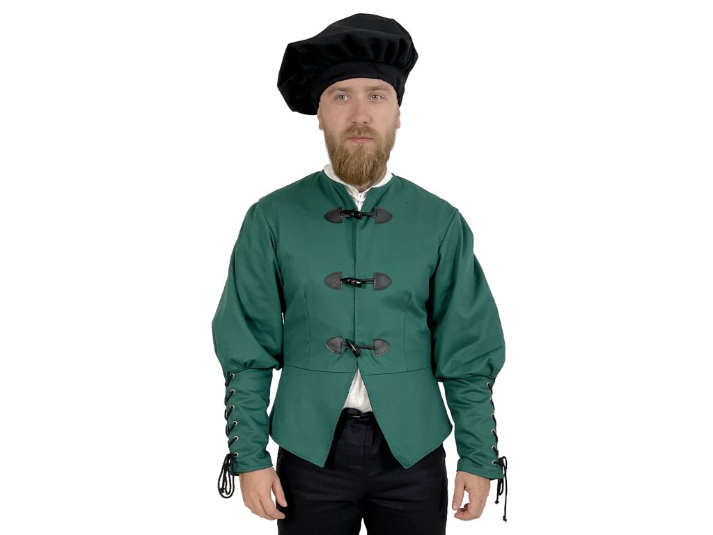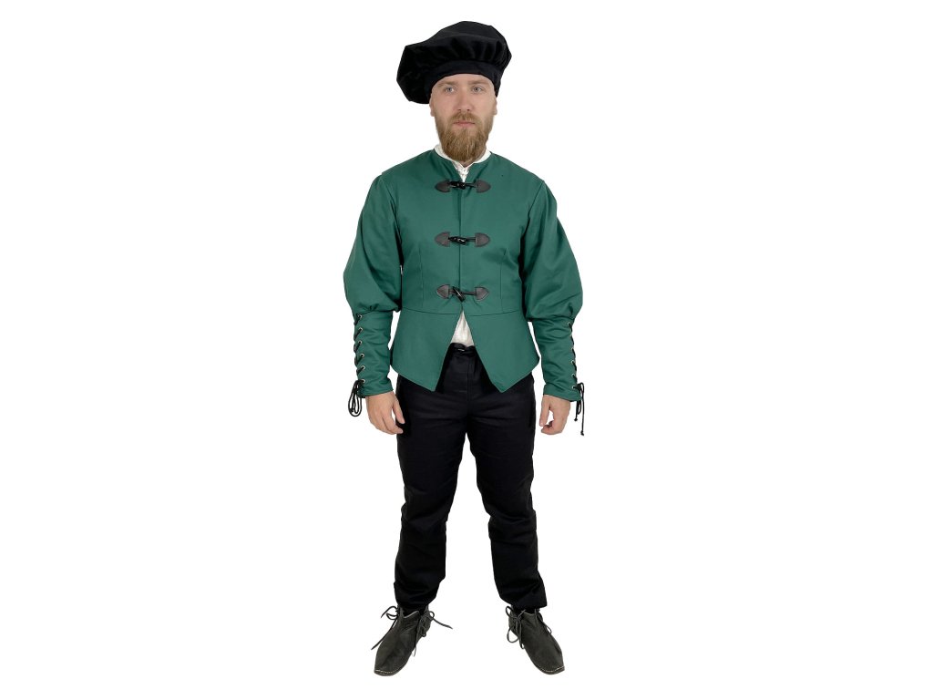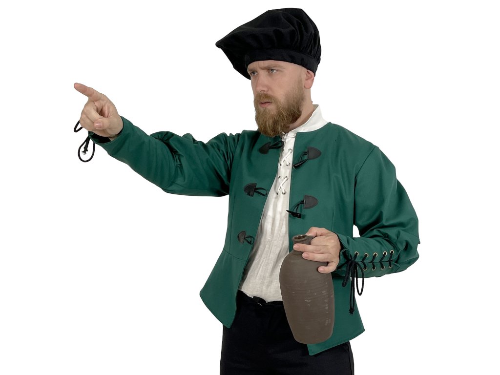 Dublet pre mešťanov – Donatello je poctivo spracovaný zelený kabátec inšpirovaný dobovým odevom mestského obyvateľstva neskorého stredoveku a raného novoveku. Tento dublet vyrábame výhradne v našej dielni – každý kus od základu navrhujeme s dôrazom na detail a funkčnosť. Základom je pevný keper (plátnová bavlnená tkanina s jemnou štruktúrou), podšitý, a to pre väčšie pohodlie a lepšie padnutie. Má elegantný, ale nie prehnane okázalý strih, ktorý vyhovuje postavám mešťanov, remeselníkov, pisárov, cechových majstrov alebo postáv z bohatších vrstiev nižšej šľachty. Vďaka praktickému zapínaniu vpredu, pevnému prevedeniu a neutrálnej červenej farbe je dublet ideálny pre kombináciu s ďalšími vrstvami odevu. Hodí sa na historické slávnosti, larpové bitky, fantasy akcie, ako divadelný kostým a na ďalšie príležitosti.