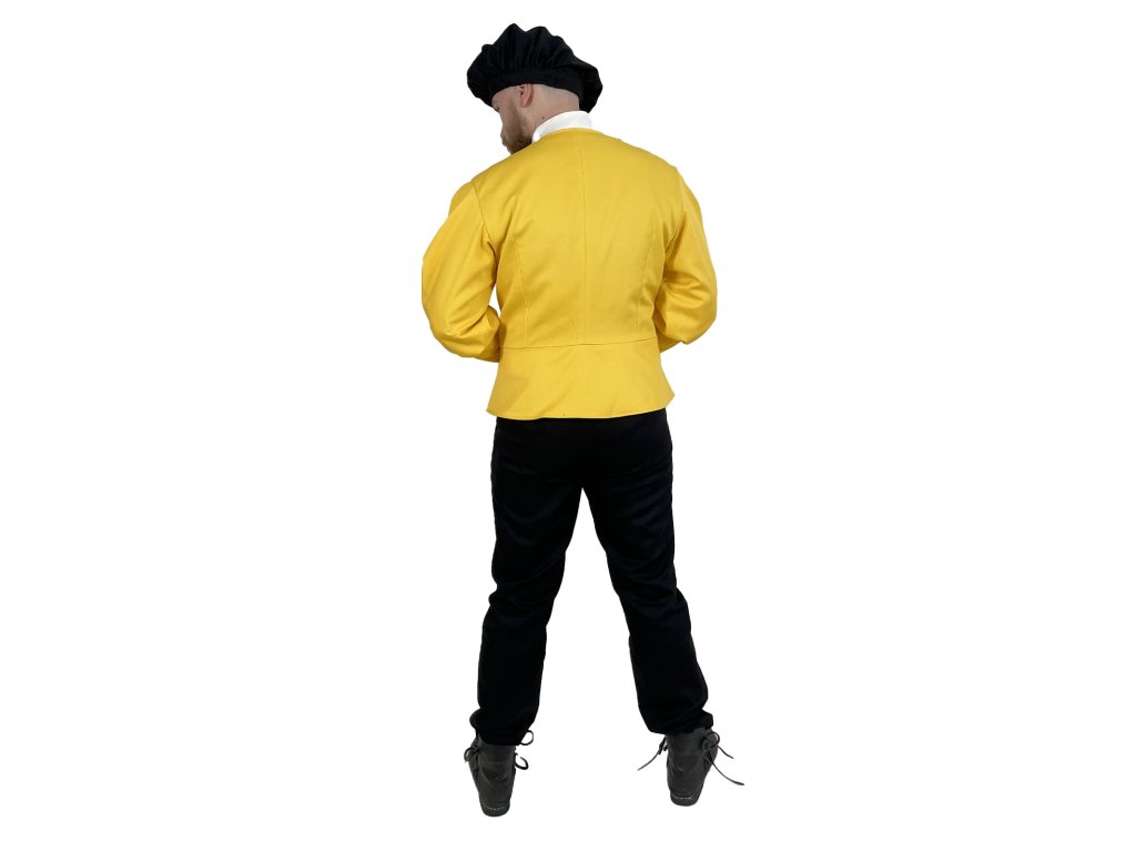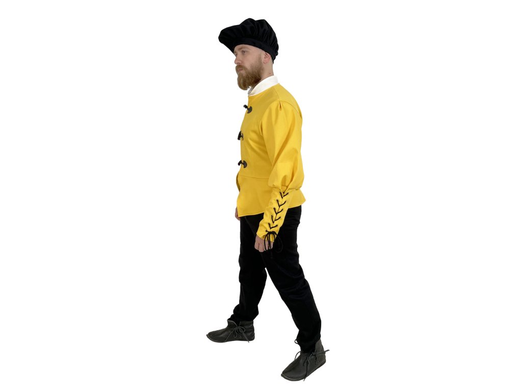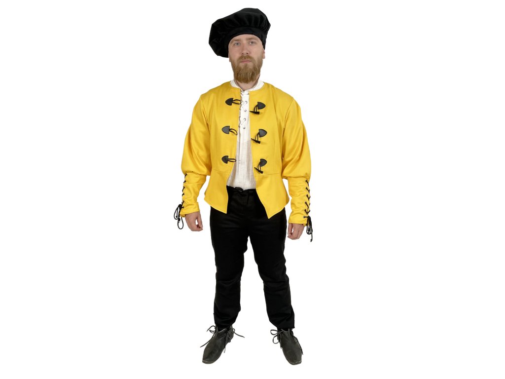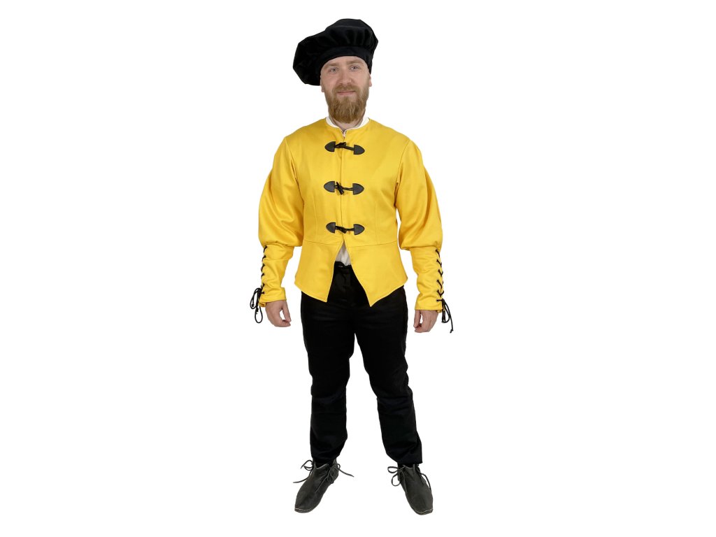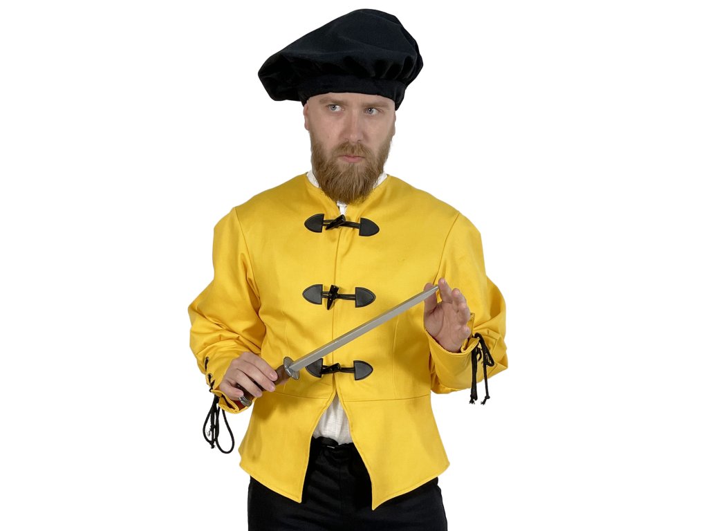 Dublet pre mešťanov – Michelangelo je poctivo spracovaný žltý kabátec inšpirovaný dobovým odevom mestského obyvateľstva neskorého stredoveku a raného novoveku. Tento dublet vyrábame výhradne v našej dielni – každý kus od základu navrhujeme s dôrazom na detail a funkčnosť. Základom je pevný keper (plátnová bavlnená tkanina s jemnou štruktúrou), podšitý, a to pre väčšie pohodlie a lepšie padnutie. Má elegantný, ale nie prehnane okázalý strih, ktorý vyhovuje postavám mešťanov, remeselníkov, pisárov, cechových majstrov alebo postáv z bohatších vrstiev nižšej šľachty. Vďaka praktickému zapínaniu vpredu, pevnému prevedeniu a neutrálnej červenej farbe je dublet ideálny pre kombináciu s ďalšími vrstvami odevu. Hodí sa na historické slávnosti, larpové bitky, fantasy akcie, ako divadelný kostým a na ďalšie príležitosti. Možno ho rôzne dozdobiť, napríklad do štýlu mocného Nilfgaardu zo sveta Zaklínača.