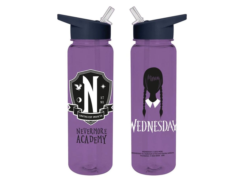 Fialová plastová fľaša na vodu s grafikou obľúbeného seriálu Wednesday vás nenechá smädiť! Fľaša nie je vhodná do umývačky riadu ani mikrovlnky.