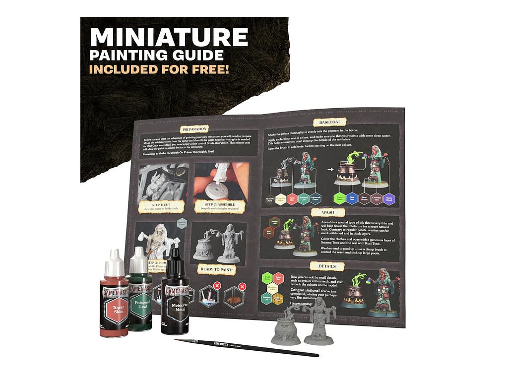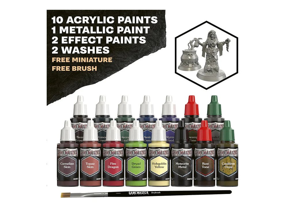 Sada Gamemaster: Wilderness Adventures - Úloha-playing Paint Set od spoločnosti Army Painter obsahuje 1 fantasy miniatúru čarodejnice, 14 farieb s miešacími guličkami, Brush-On Primer, štetec a príručku - všetko potrebné, aby ste sa mohli pustiť do farbenia - či už začínate alebo sa tomuto koníčku von! Obsah balenia: 1 miniatúra čarodejnice 15 Warpaints Fanatic TM (každá s objemom 18ml) 1 štetec Drybrush 1 sprievodca maľovaním Warpaints Fanatic TM: Skin, Meteorite Metal, Swamp Tone, Rust Tone, Cauldron Ooze a Brush-On Primer.