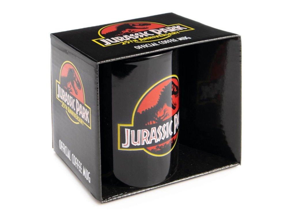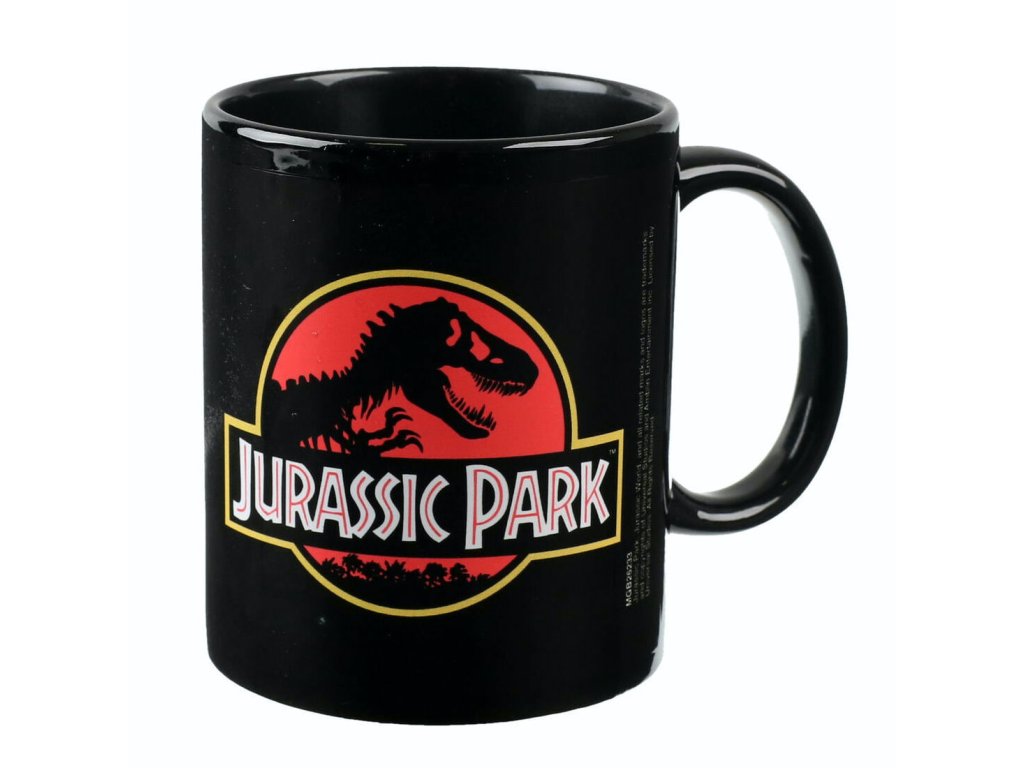 Čierny keramický hrnček s logom nestarnúci dinosaurie klasiky Jurrasic Park. Hrnček je možné umývať v umývačke riadu a ohrievať v mikrovlnnej rúre.