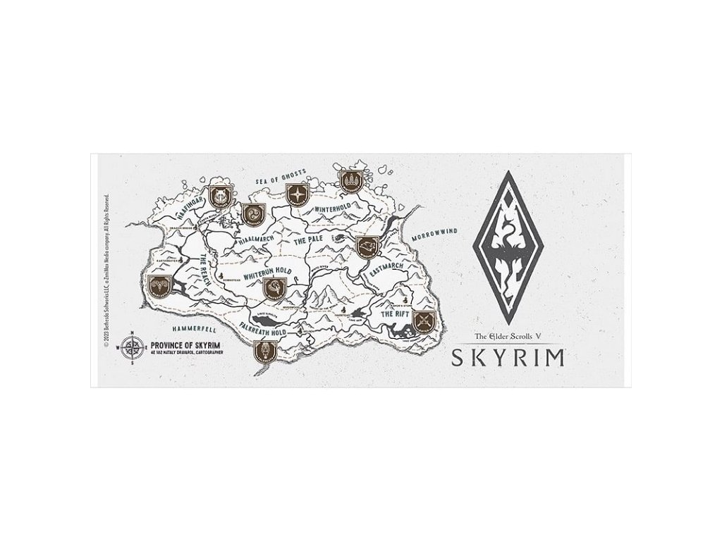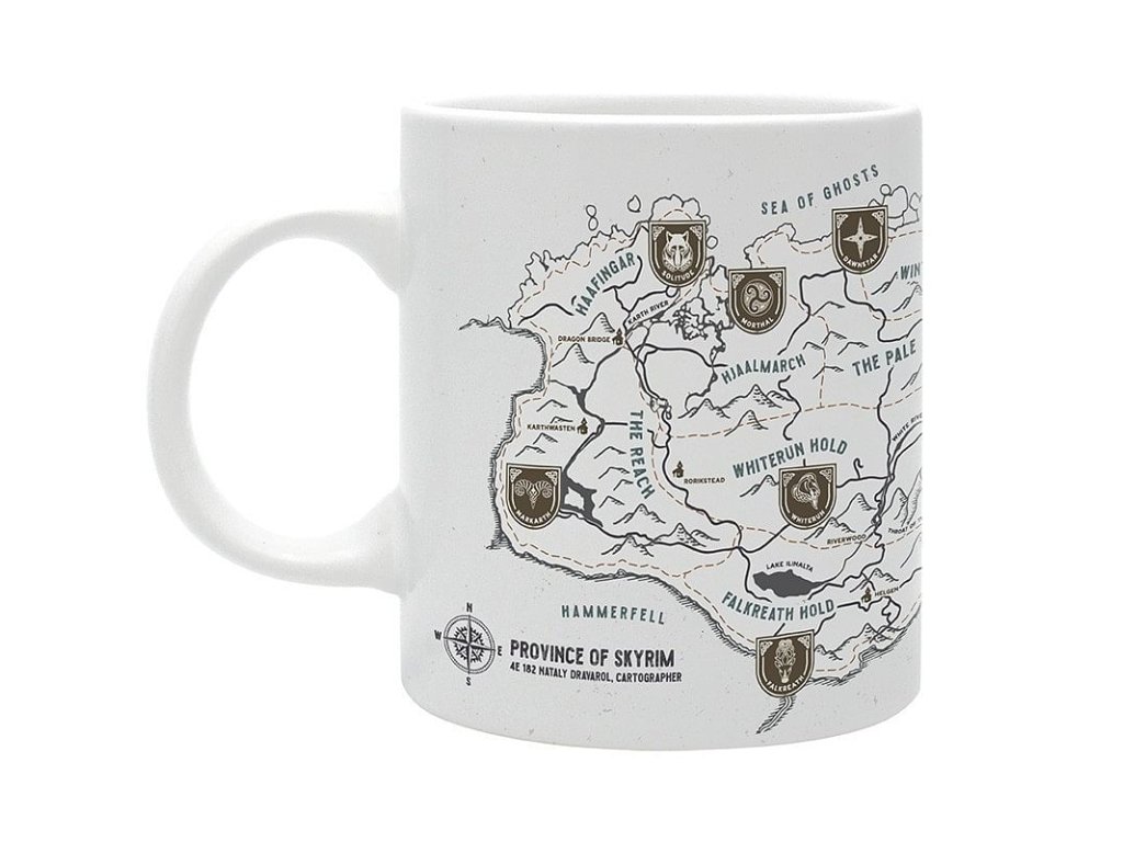 Kam sa nabudúce vydáte za dobrodružstvom? Biely hrnček s mapou sveta obľúbenej RPG videohry The Elder Scrolls V: Skyrim vás občerství a inšpiruje.