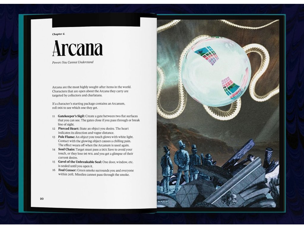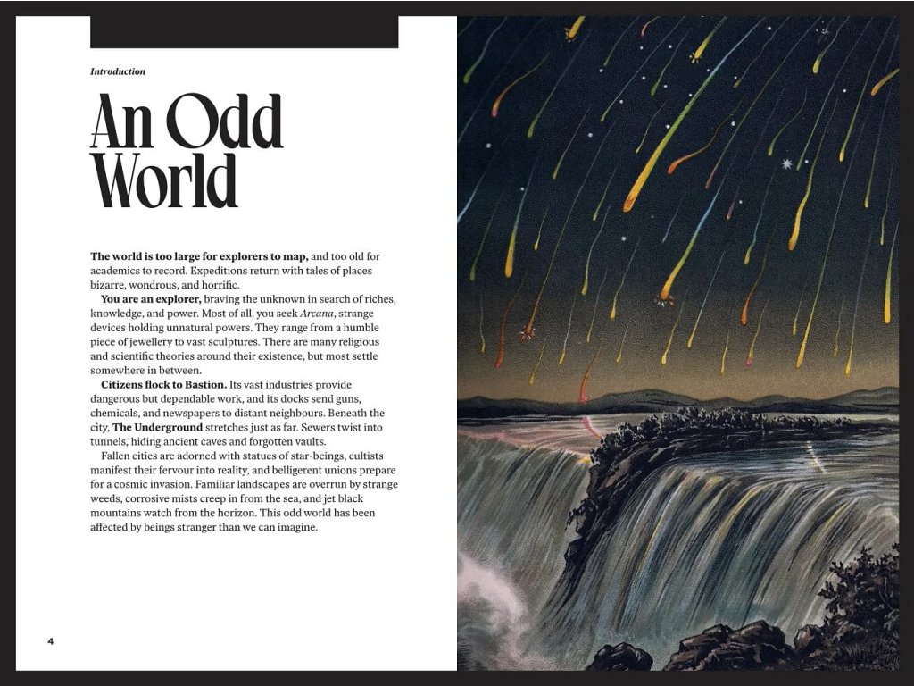 Into the Odd Remastered je hra na hrdinov plná industriálneho hororu a z podivností z vesmíru. Príručka je v angličtine. Bastion is only city that matters. V jeho priemyselnom age, jeho sity ako smoke-zrútený hub mankindu, surrounded by a svet lurking horrors a kozmickej interferencie. Underground spreads beneath naše nohy a hviezdy loom nad. Sú to Explorer, braving places too far pre mapy a too old for records. Vaša expedícia dotýkajú bizarne, wondrous, a horrific. You search for riches, ale aj Arcana, mysterious devices with unnatural powers. Into the Odd Remastered is rules-light, flavor-heavy roleplaying hra priemyselného hororu a kozmickej strangeness. Táto nová úprava do Odd z 2014 revízie priemyselného bastionlandu, dáva originálnu hru a lavish hardback, úplná farebná reštarácia s rozšíreným obsahom. Napísal Chris McDowall (Electric Bastionland) as grafickým dizajnom Johan Nohr (MÖRK BORG), je publikovaný na Free League Workshop, náš sub-label pre bezproblémovo selected externally developed games. The full-color books má 144 stránok v digitálnom formáte. Obsah príručky: Fast Character Creation - Roll an explorer v minútach, grabbing a štartér Package of flavourful equipment and starting your expedition. Minimalist Rules - An ultralite systém, ktorý vedie k hre moving forward. Combat je fast and decisive, with every turn counting. Strange Things - Monsters sú horrific hazards, no opponents to be fought for sport. Arcana je veľký artifacts, že ich carry a unique ability, z firing portálov to inkoust bones like a magnet. Return to Iron Coral - široká expedičná miestnosť z originálnej hry má tripled in size, teraz sprawling over three levels. The surrounding Fallen Marsh teraz hides štyri mini-dungeons in jeho 24 hexes. Na severe, desperate port z Hopesend víta adventurous travellers hľadajúc na go further. The Expanded Oddpendium - 26 strán modulov a random tables na pomoc vám flesh out the world. Roll to vytvorí weird creatures, vyhľadať najlepšie shortcut cez mesto, a vyhľadať čo šťastie keď ste “jesť stuff”. Into the Odd is masterpiece of minimalism – an enchanting blend of old school principles and modern design which has served me well both for impromptu one shots as well as storied campaigns. Moja well-worn originálna kopia je vždy v mojej taške, pripravená keď sa strihajú na spánok na večerné pokračovanie do strán. - John Harper (Blades in the Dark, Lady Blackbird, Lasers & Feelings): Into the Odd does minimalist fantasy roleplaying better than anything else. Lightning fast and oozing with flavor. –Ben Milton (Questing Beast, Maze Rats, Knave) My randomly-generated charakter had na eyepatch, whip a krabice cigary a Aj vo never felt more immediately interested in a protagonist. –Grant Howitt (Spire, Heart, Honey Heist):