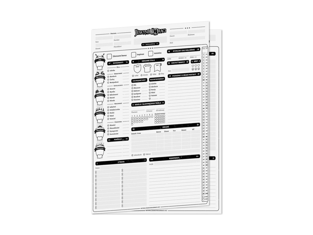 Praktický denník – karta postavy pre českú fantasy hru na hrdinov Jaskyne a draci. Karta obsahuje 4 stránky formátu A4, tlačená je na papier veľkosti A3 preložený napoly. V karte nájdete všetko potrebné na záznam o vašej postave.