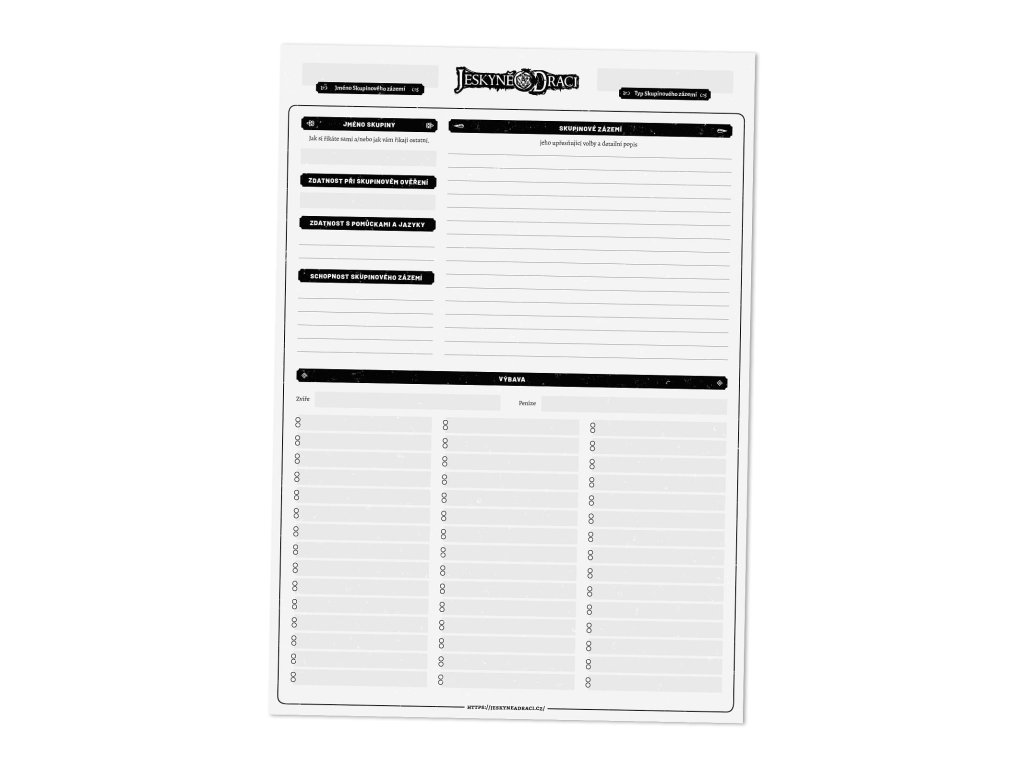 Tlačená karta skupiny pre fantasy hru na hrdinov Jaskyne a draci vo formáte A4. Na karte nájdete všetko potrebné, pre zaznamenávanie informácií o vašej družine.