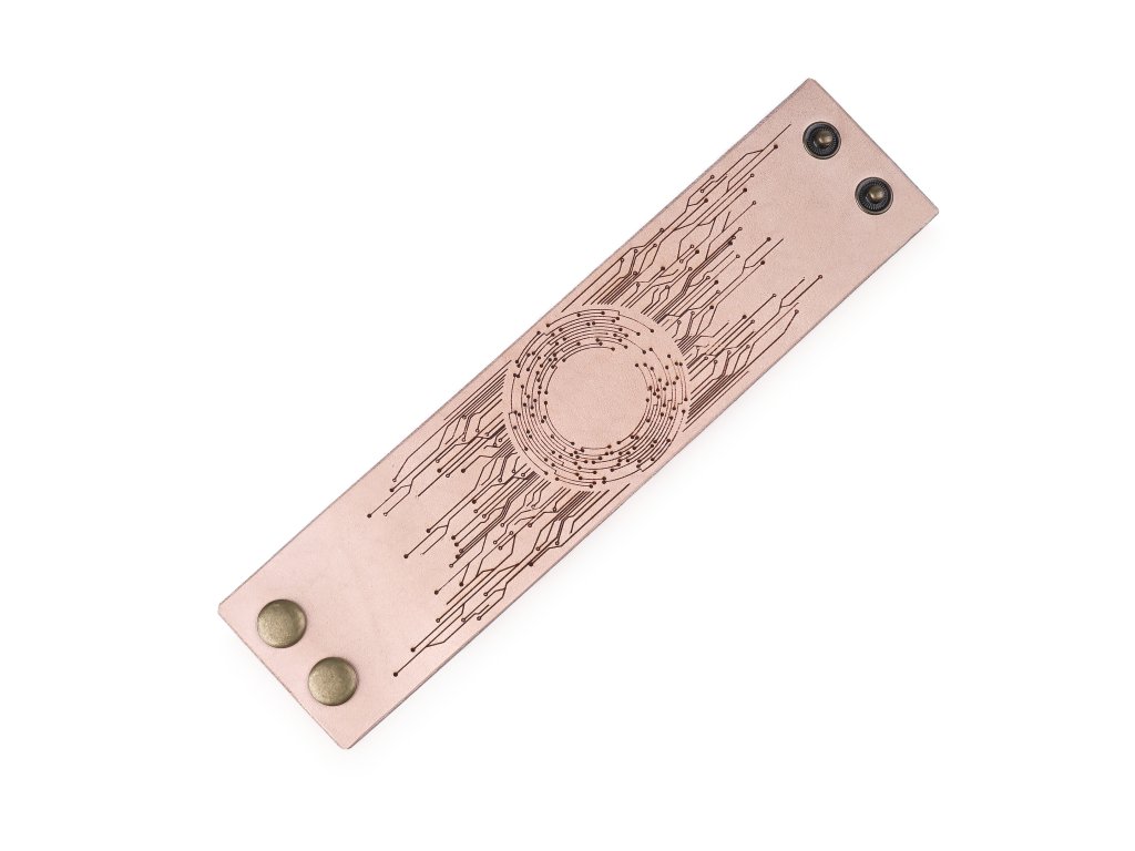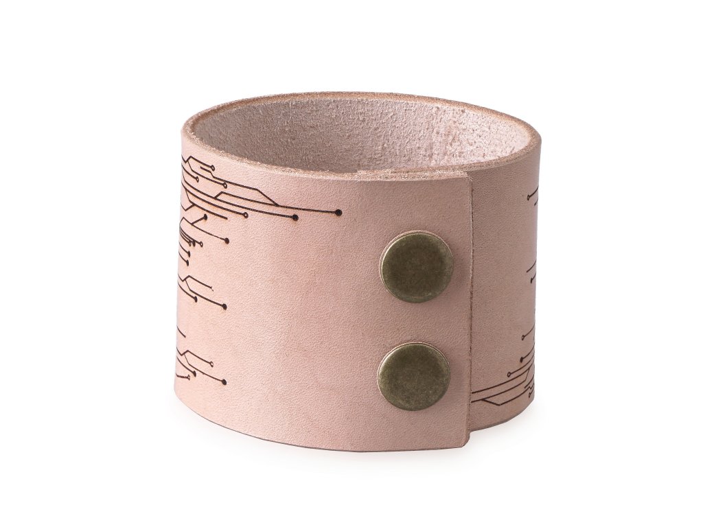 Na uliciach sa možno netúlajú roboti a kvalitný cyberware sa najskôr vyvíja iba v tajných laboratóriách svetových veľmocí, ale apokalypsa už je určite za rohom. Až príde, budete vďaka nám aspoň vyzerať štýlovo. S elegantným náramkom z našej brašnárskej dielne urobíte perfektný dojem v tej najhoršej putyke aj na schôdzke vašej obľúbenej megakorporácie. Je vyrobený z lakovanej 2 - 3 mm hrubej hovädzej kože, ktorá je príjemná na nosenie a nedráždi pokožku. Náramok bude vašim spoločníkom na veľmi dlhú dobu – obzvlášť, keď sa oň budete dobre starať. Náramok má zapínanie na cvočky a môžete si vybrať z variantov v dvoch rôznych dĺžkach – 21 cm (obvod zápästia 19 cm) a 24 cm (obvod zápästia 22 cm). Šírka náramku je 5 cm a zdobia ho ornamenty inšpirované elektronikou a tlačenými spojmi. Zaobstarajte si cyberpunkový náramok už dnes, zajtra môže byť neskoro. Odporúčajú štyria z piatich hackerov.