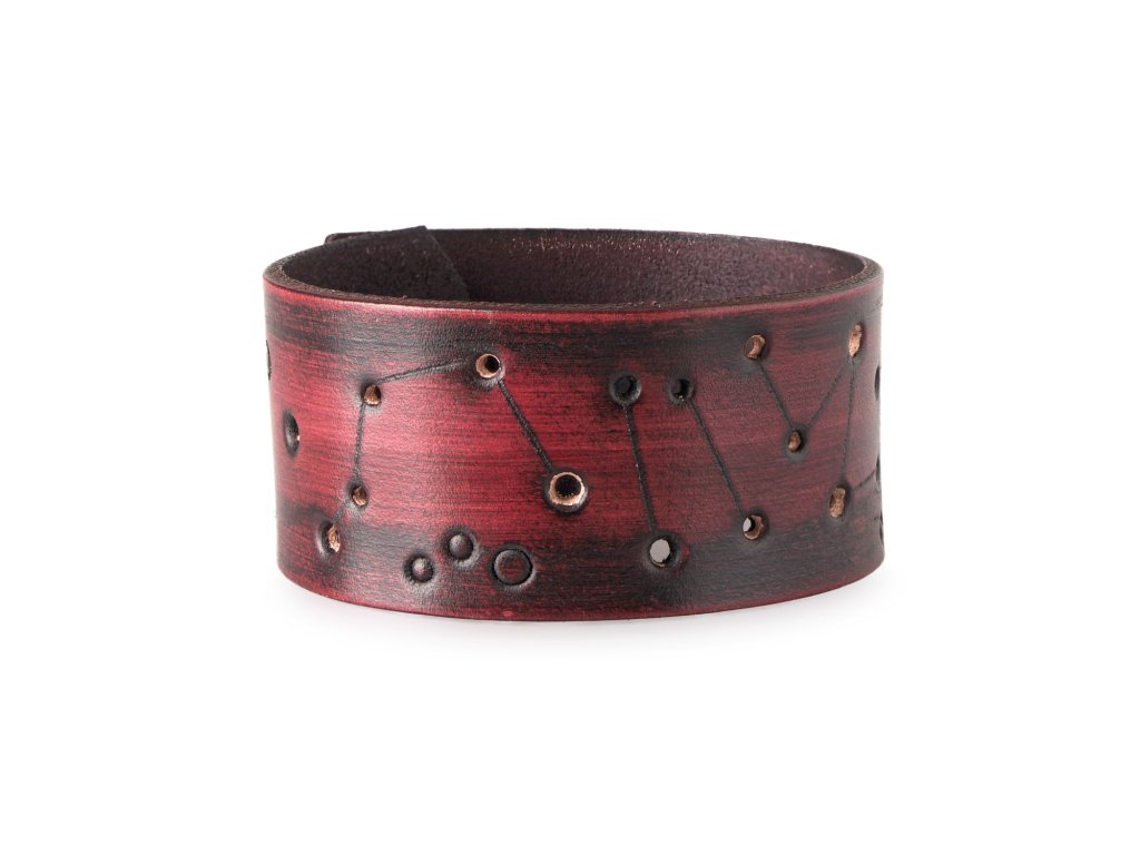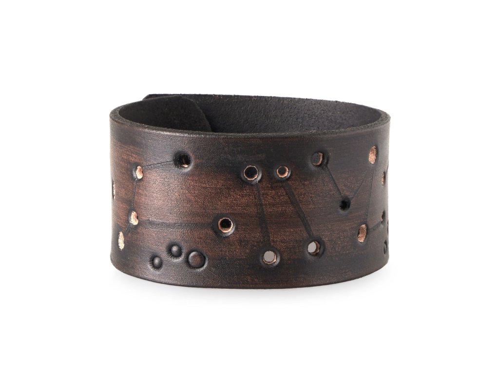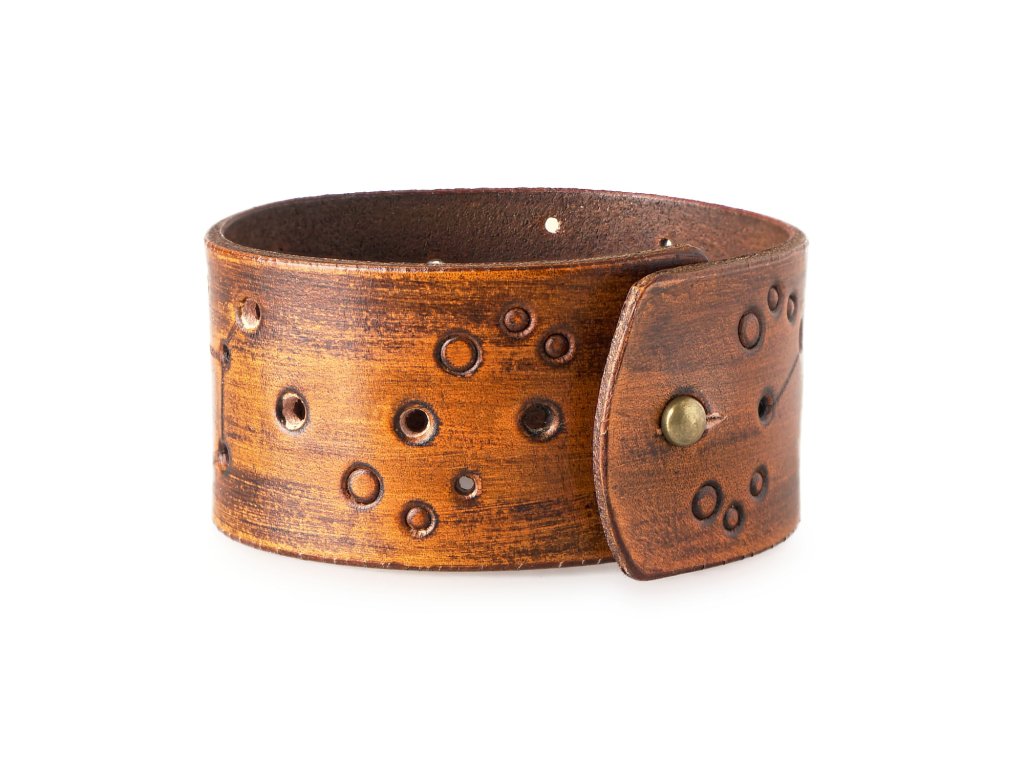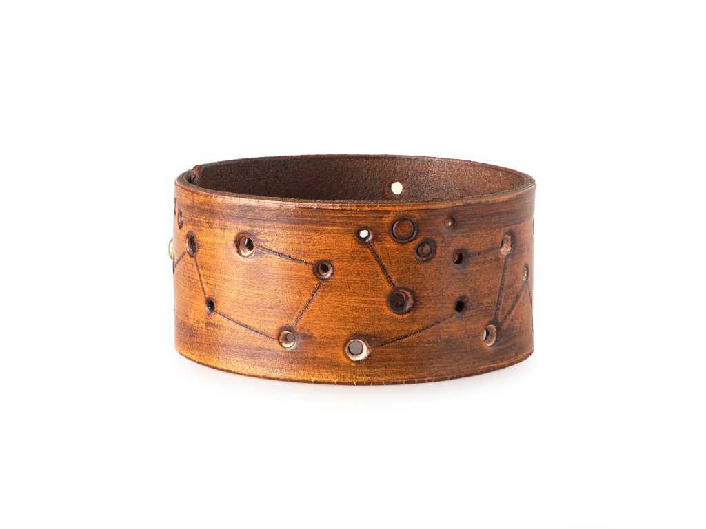 Majte hviezdne súhvezdia na dosah ruky! Jedinečný kožený náramok so súhvezdiami ďalekých galaxií očarí každého. Kožený náramok Galaxie vyrábame ručne v našej dielni z kvalitnej hovädzej kože s hrúbkou 2 mm. Veľkosť koženého náramku sa dá nastaviť pomocou kovového štipca, ktorý ponúka až 4 možnosti nastavenia šírky obvodu vašej ruky (od 18,5 cm až do 23,5 cm). Celková dĺžka náramku je cca 25,5 cm.