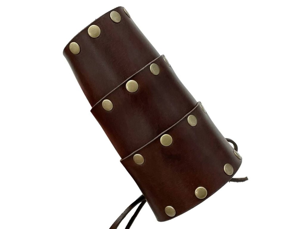 Poriadny nátepník je základnou výbavou každého správneho bojovníka! Kožený nátepník nitovaný vyrábame z hovädziny hrubej cca 2,5 mm. Nátepník je znitovaný z 3 pruhov kože širokých 7 cm. V najužšom mieste - určenom na ochranu zápästia - je nátepník široký 20 cm, v najširšom mieste - najbližšie k lakťu - potom 27 cm. Vďaka šnurovacej koženej šnúrke má však univerzálnu veľkosť. Dĺžka nátepníka 17 cm, min. obvod zápästia 17,5 cm Nátepník vyrába naši sedliari v dvoch farbách: čiernej a hnedej. Proces farbenia prebieha kompletným morením. Čierna varianta je znitovaná striebornými nitmi, hnedá mosadznými. V oboch prípadoch ich na nátepníku nájdete 28 ks. Uvedená cena je za jeden nátepník.