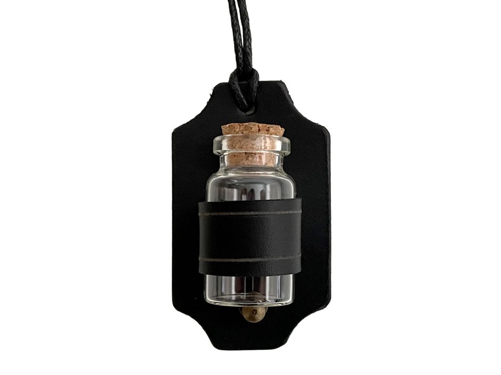 Či už si alchymista, čarodejník, liečiteľka alebo temný žoldnier, bez svojej vernej fľaštičky nevyrazíš do sveta. Tento ručne vyrobený kožený záves s malou sklenenou fľaštičkou je perfektný doplnok ku každému fantasy alebo historickému kostýmu. Zaves si ho na opasok a maj vždy po ruke elixír života, jed na čepeľ, dračiu krv alebo štipku víliaho prachu – fantázii sa medze nekladú! Záves o rozmere 7 x 4 cm je vyrobený z kvalitnej hovädzej kože u nás v imago dielni - ručne farbený a šitý. Sklenenú fľaštičku o veľkosti 4 cm s korkom drží pevne a bezpečne! Na výber máš z 3 farieb: prírodná, čierna a hnedá.