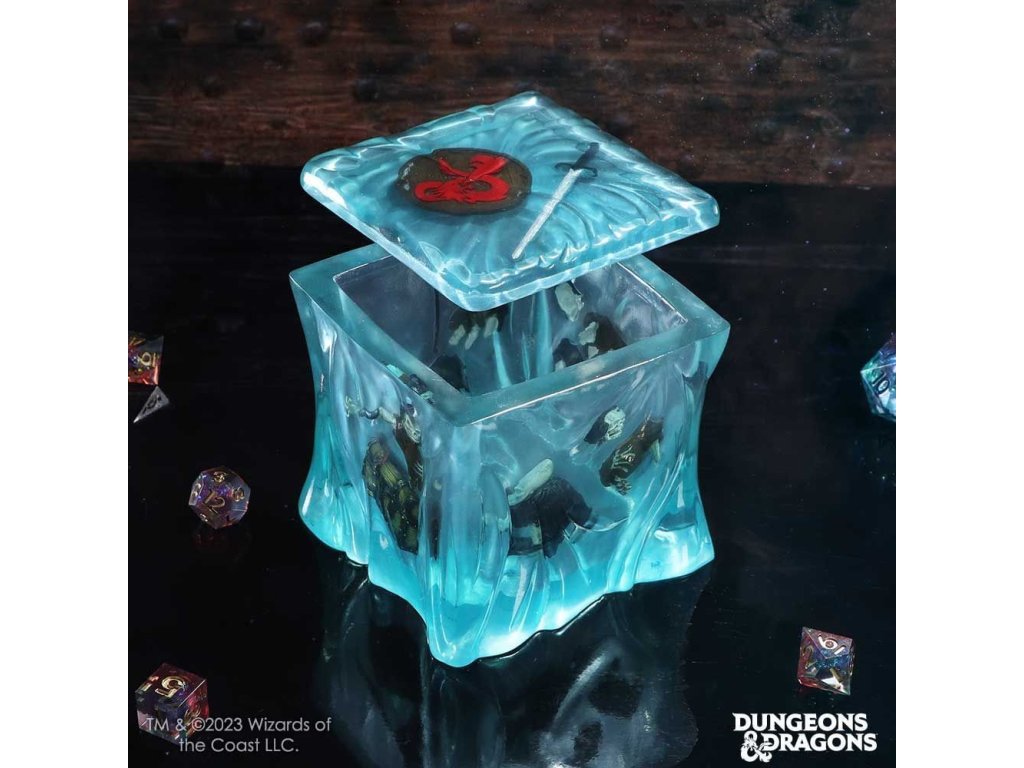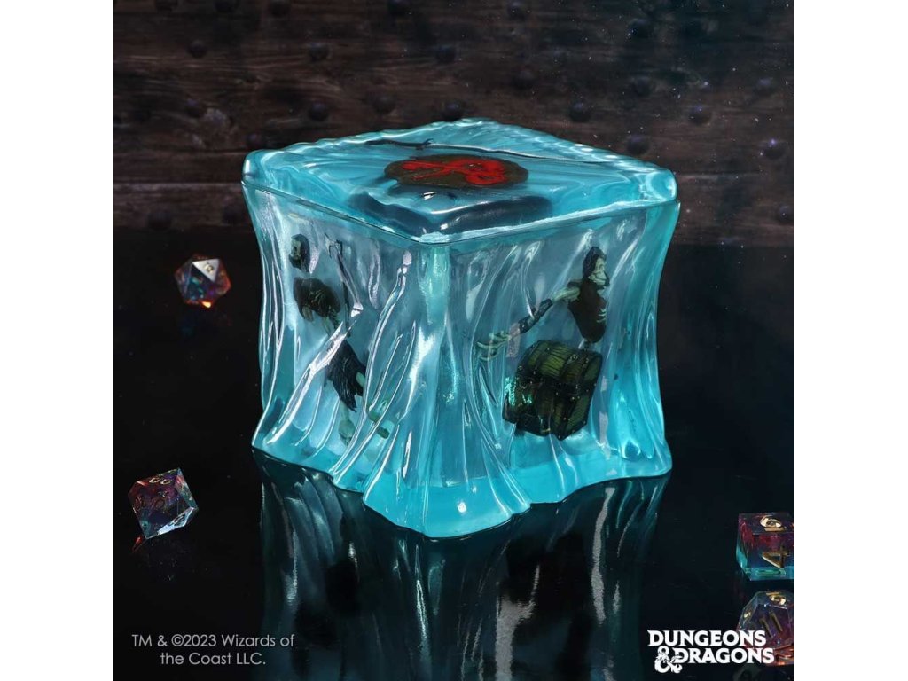 Vystav si parádnu dekoratívnu krabičku na kocky v podobe žieravej a leptavej Gelatinous cube (želatínovej kocky) z hry na hrdinov Dungeons & Dragons! Skvelý doplnok pre herný stôl, ktorú môžeš využiť ako Dice jail pre tvoje prekliate kocky! Kocka je zo šiestich panelov, ďalších 14 dielikov príslušenstva a podstavca. Dovnútra potom môžeš vložiť aj figúrku štandardnej veľkosti.