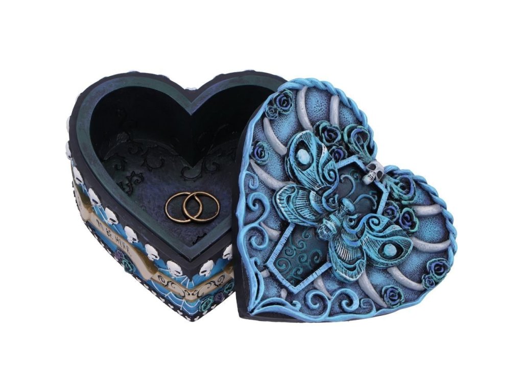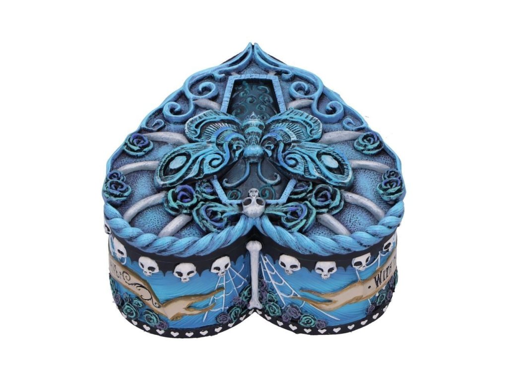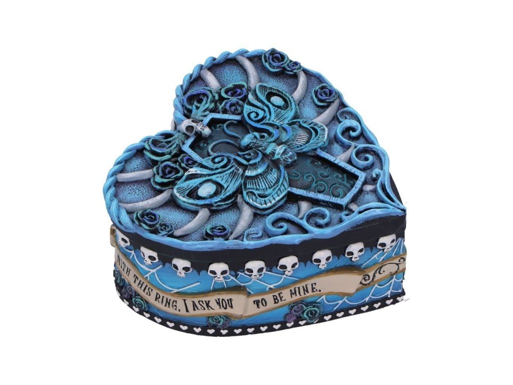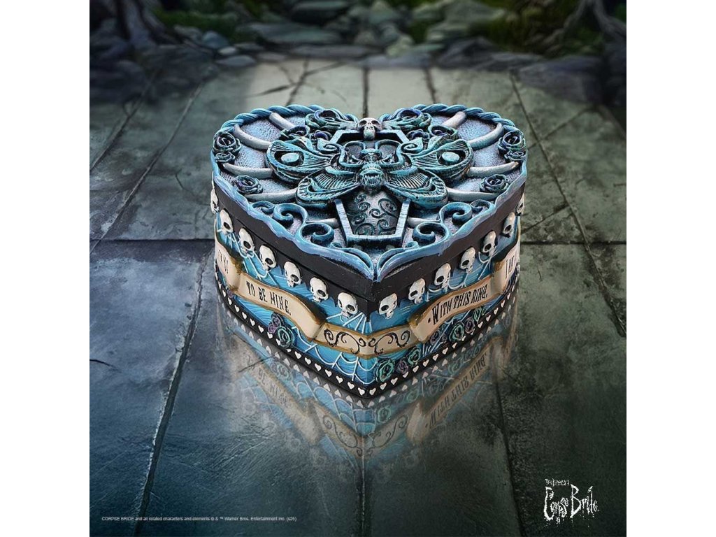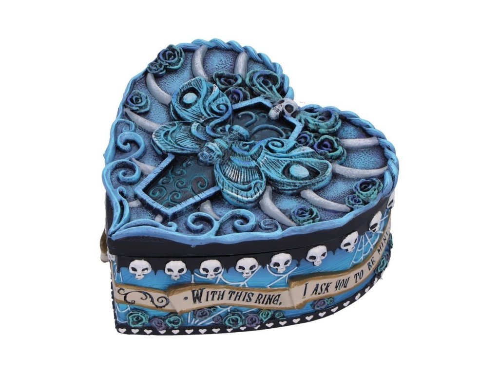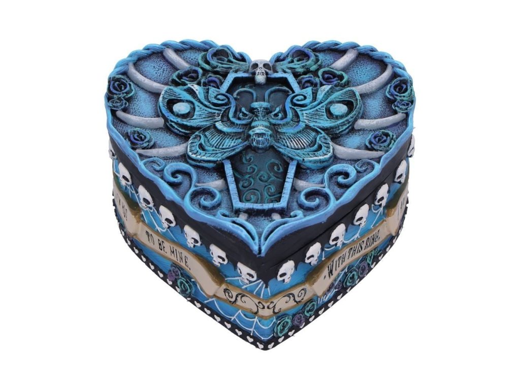 Krabičku na šperky v podobe srdca zdobia motívy z gotického a fascinujúceho animáku Mŕtva nevesta od Tima Burtona. Táto ručne maľovaná šperkovnica sa hodí pre tie najcennejšie poklady aj ako napr. darčeková krabička k Halloweenu. Krabička má odnímateľné viečko a bude vskutku originálnym príbytkom pre tvoje poklady!