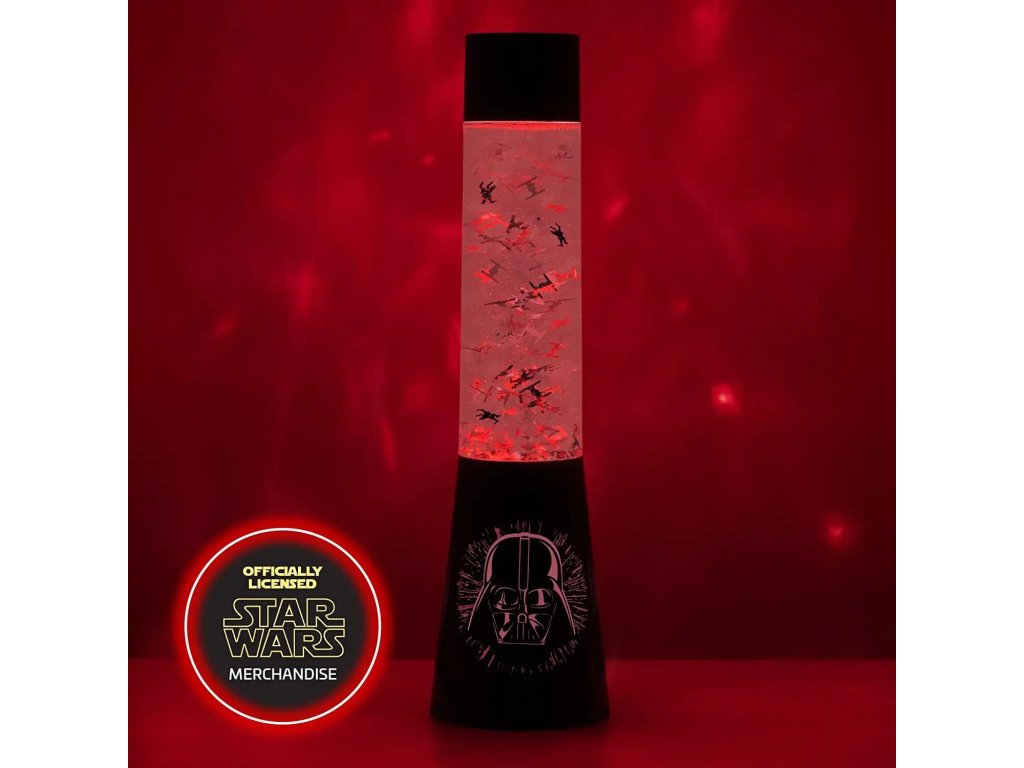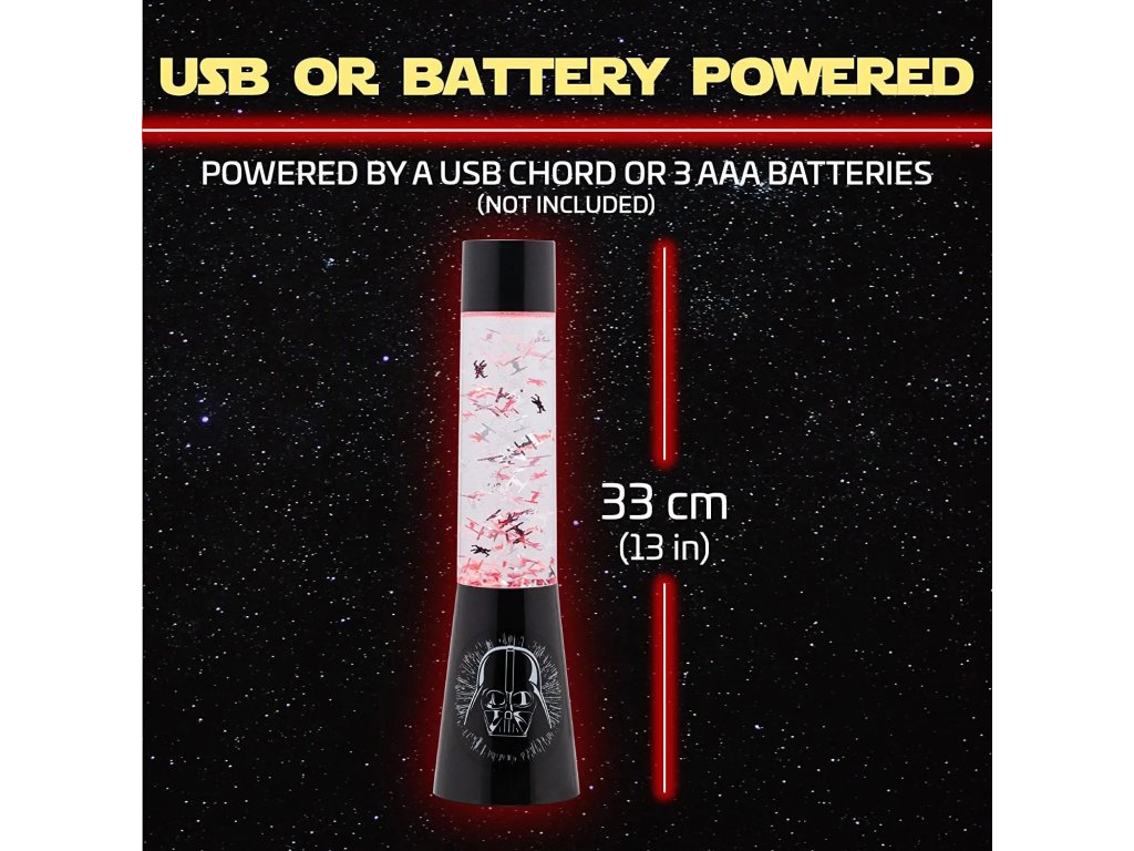 Originálna lampa pre fanúšikov Star Wars premení vašu izbu alebo pracovňu na skutočné galaktickej zákutia! Sledujte stíhačky X-Wing a TIE v prebiehajúcom súboji, na ktorý z podstavca dohliada sám lord Darth Vader! Lampa so stĺpcom červeného svetla bude krásnym darčekom pre fanúšikov Hviezdnych vojen. Lampa je napájaná pomocou USB alebo 3 ks batérií AAA (ani kábel ani batéria nie sú súčasťou balenia).