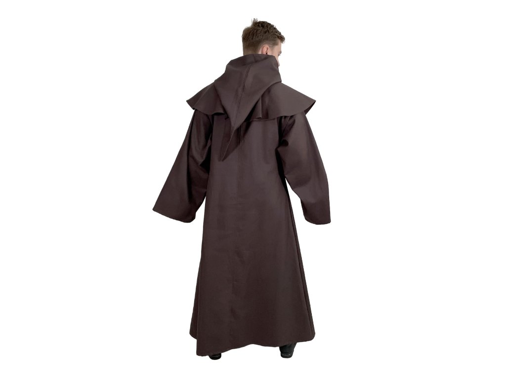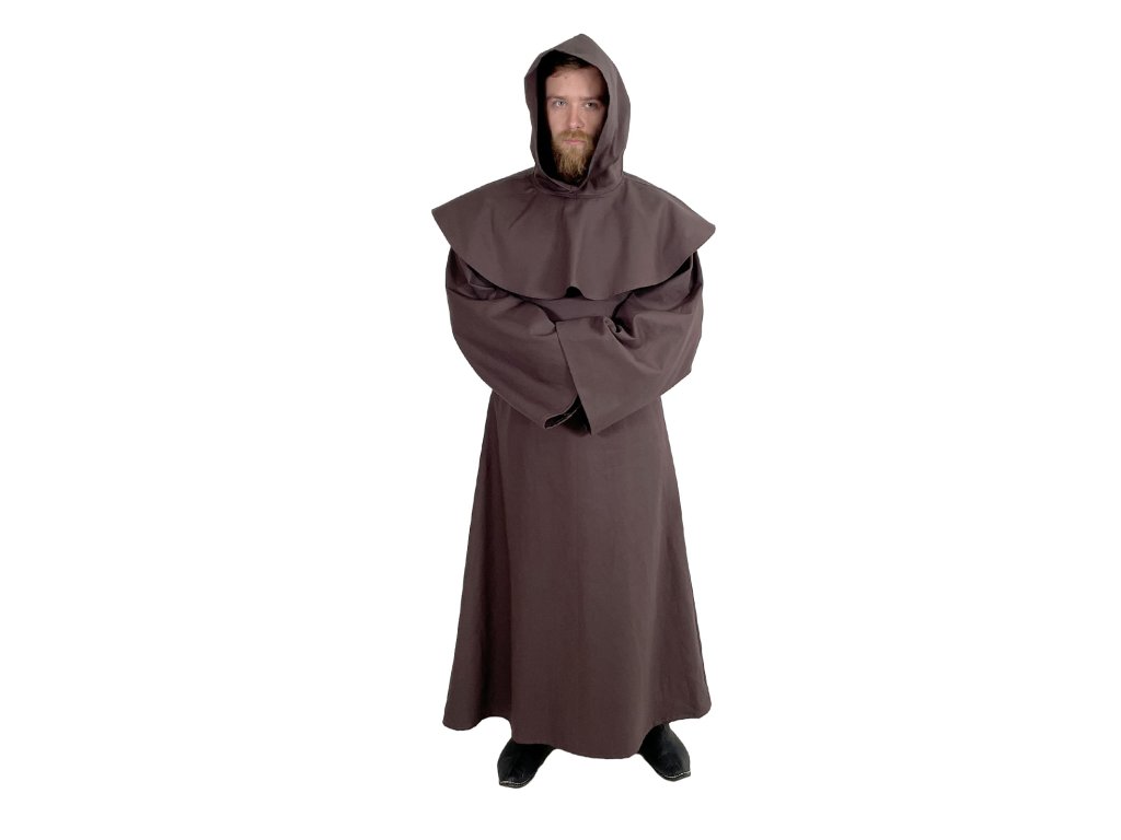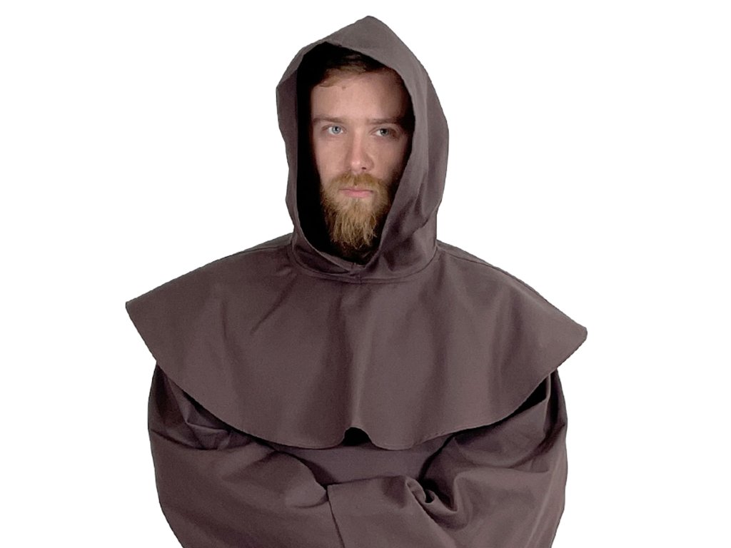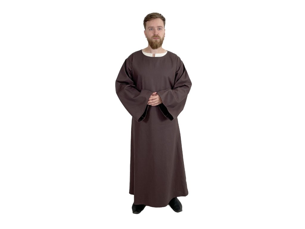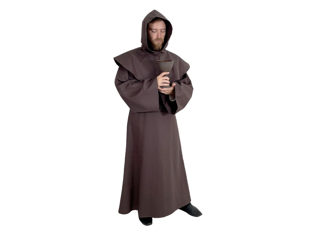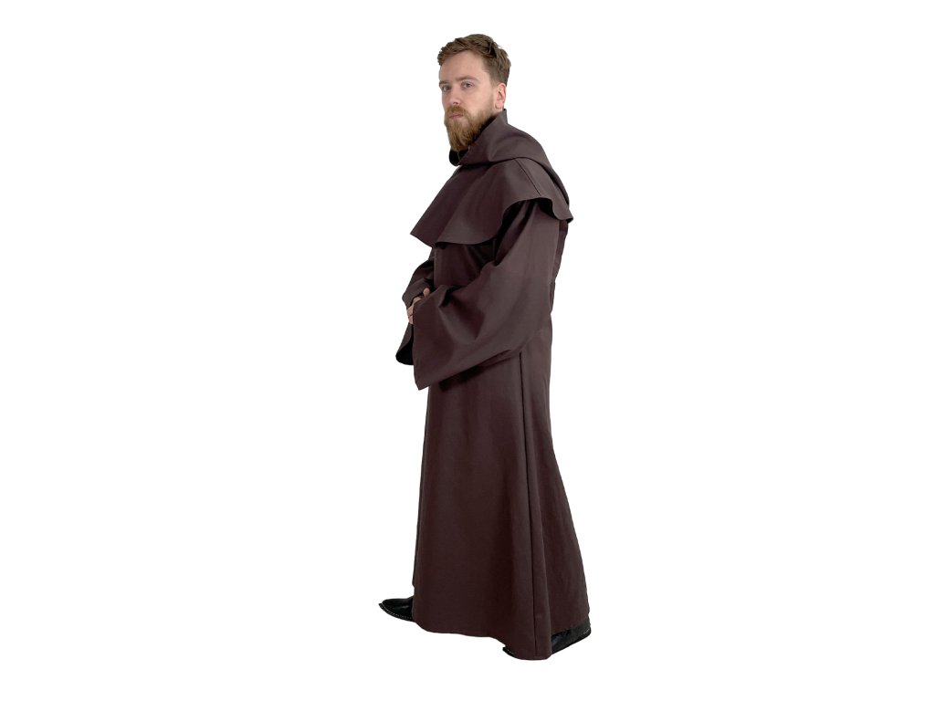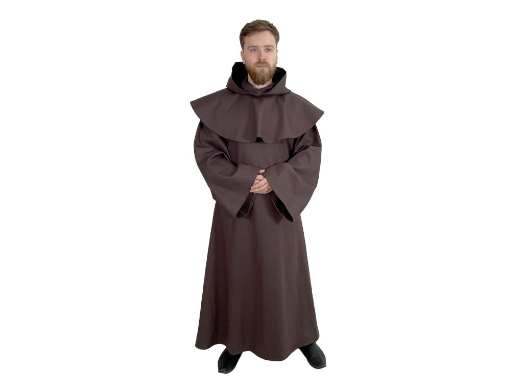 Táto hnedá mníšska kutna je ideálna pre širokú škálu postáv na LARP, fantasy a historické akcie. Staň sa pútnikom, liečiteľom, bylinkárom, vidieckym mníchom! Je nenápadná, funkčná a ľahko kombinovateľná s ďalšími vrstvami alebo doplnkami. Hnedá farba pôsobí prírodne, neutrálne a všestranne. Ušitá je z pevného bavlneného kepru - pre pohyb v lese, ruinách aj chrámových sálach. Ručná výroba v našej dielni zaručuje, že každý kus má svoj charakter a vydrží aj akčné LARP. Kutna sa skladá z dvoch častí - kapucňa a tuniky. Kapa má univerzálnu veľkosť a rozmery mníšskej kutny sa určujú podľa veľkosti tuniky. Model má výšku 178 cm a nosí veľkosť M.