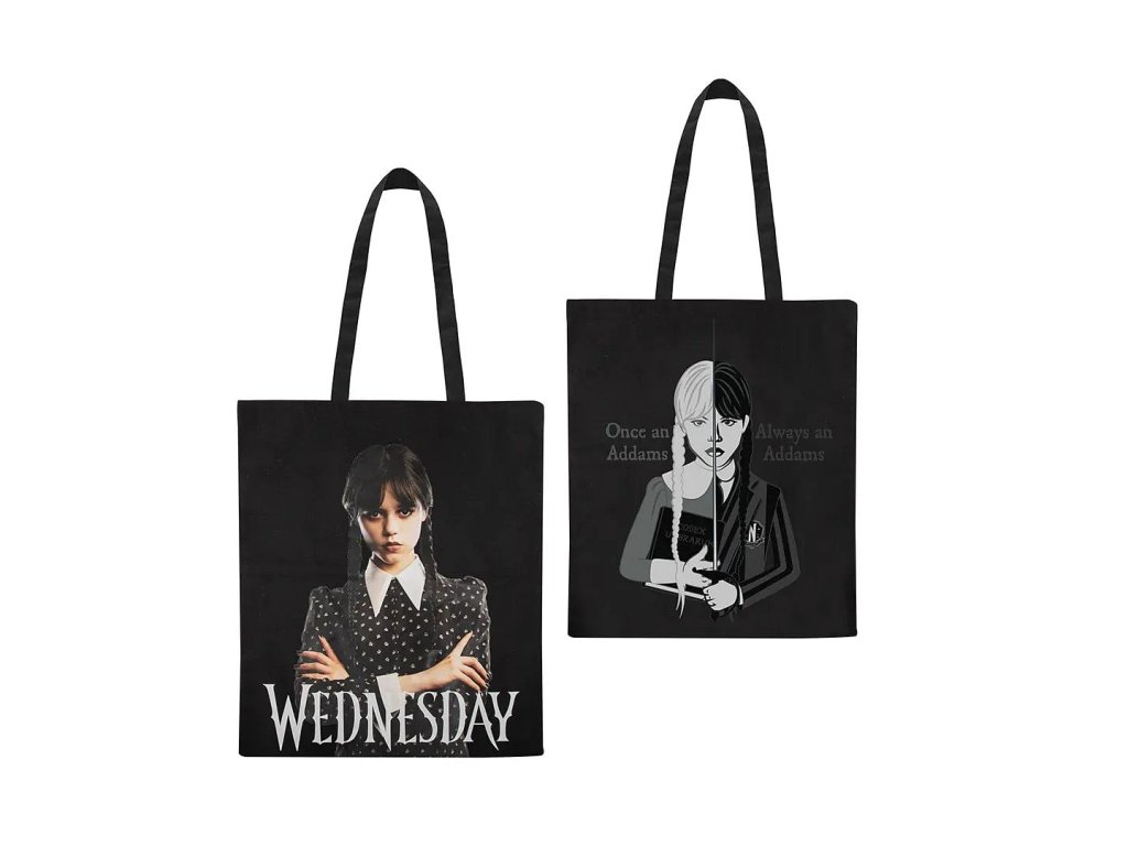 Vydajte sa na nákup v spoločnosti praktickej čiernej tašky, ktorú zdobí obrázok vašej obľúbenej hrdinky Wednesday Addamsovej z rovnomenného seriálu!