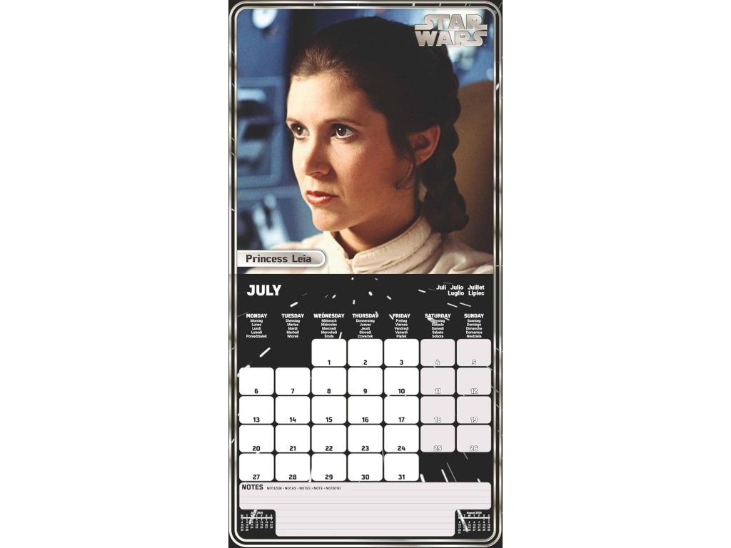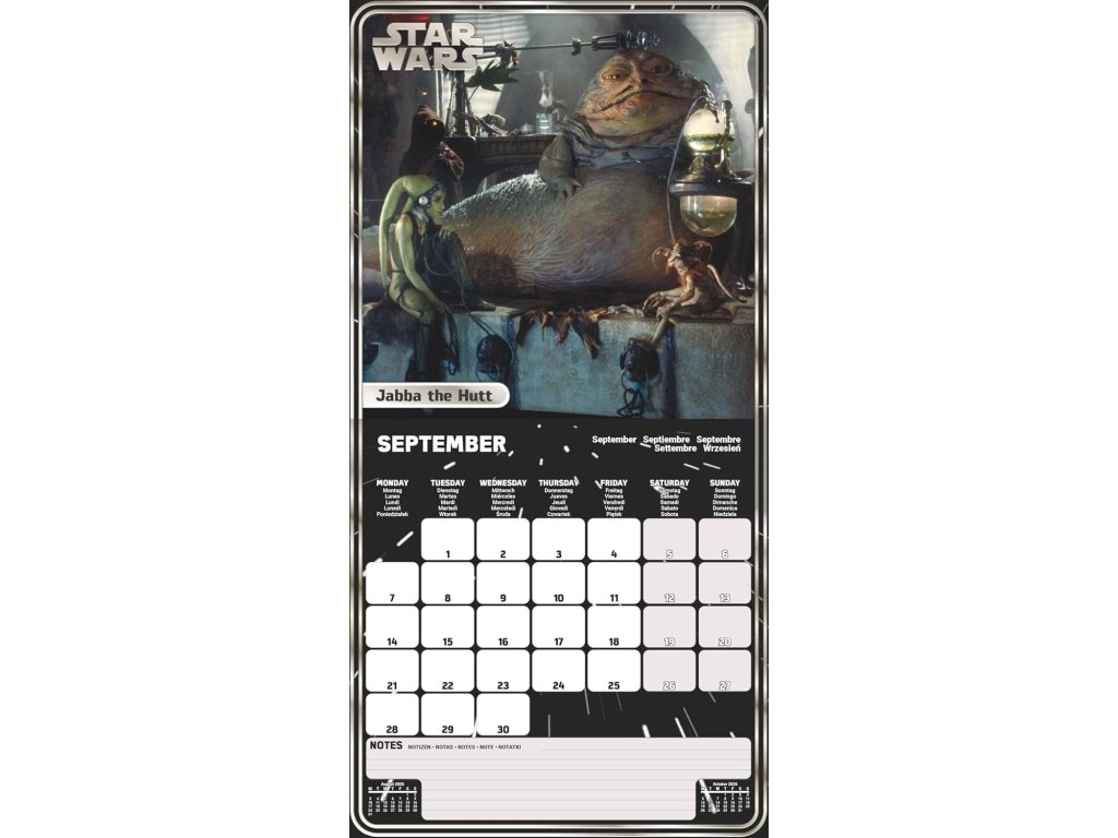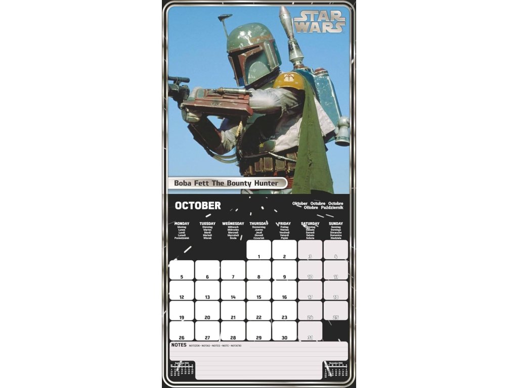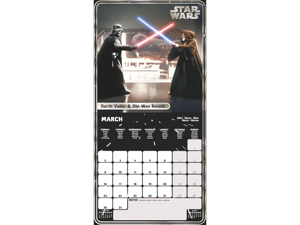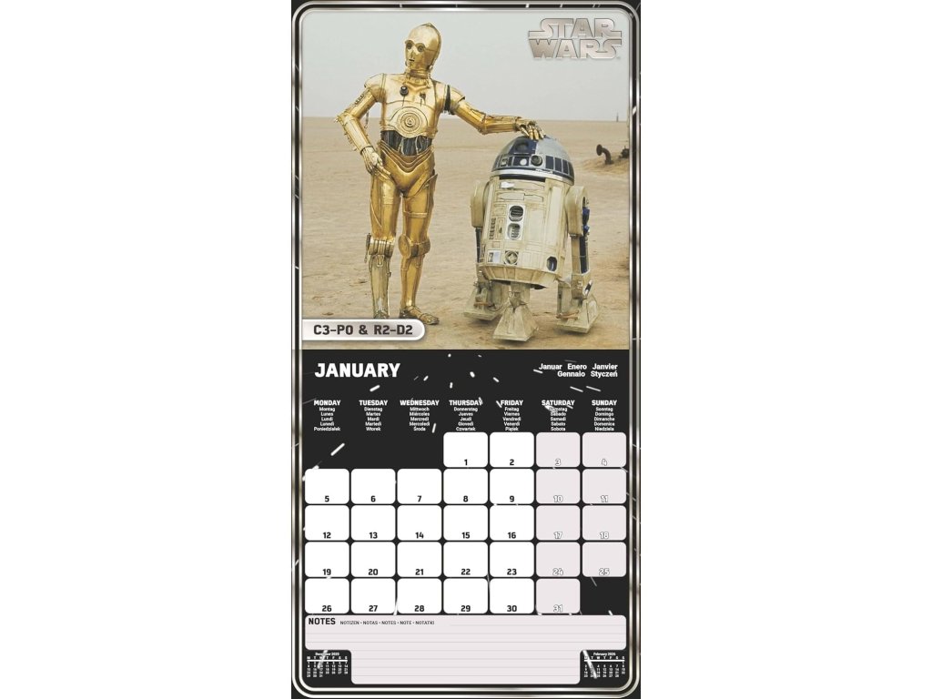 Uži si každý mesiac roku 2026 spolu s nástenným kalendárom pre fanúšikov Star Wars – Hviezdnych vojen! Po celý rok ťa budú sprevádzať výjavy z prvej filmovej trilógie a známej postavy, ako sú napríklad Luke Skywalker, princezná Leia Organa, lord Darth Vader, droidi R2-D2 a C-3PO, Obi-Wan Kenobi, Han Solo, Wookie Žvejkal, Jabba Hutt alebo Boba Súčasťou oficiálneho kalendára z predalekej galaxie sú tiež september až december roku 2025, takže získaš rovno 16 krásnych veľkých obrázkov. Dátové rámčeky poskytujú dostatok miesta na poznámky o narodeninách, schôdzkach, koncertoch a ďalších dôležitých udalostiach pre rok 2026. Kalendár je v angličtine a neobsahuje slovenské sviatky.