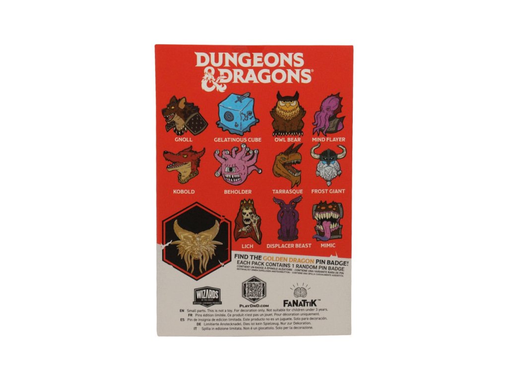 S tebou už od roku 1974! Osláv úžasné 50. výročie stolnej RPG hry Dungeons & Dragons. Pridaj sa k nám, staň sa hrdinom a zaži mysteriózny pocit z výberu krabičky, ktorá obsahuje 1 z 12 tajomných odznakov. Každý odznak je kovový, smaltovaný a silne reliéfny. Medzi odznaky môžeš nájsť také obľúbené mosty ako Mimic, Gelatinous Cube, Owlbear, Beholder a ďalšie! V každej krabičke máš možnosť tiež objaviť vzácny zlatý odznak!