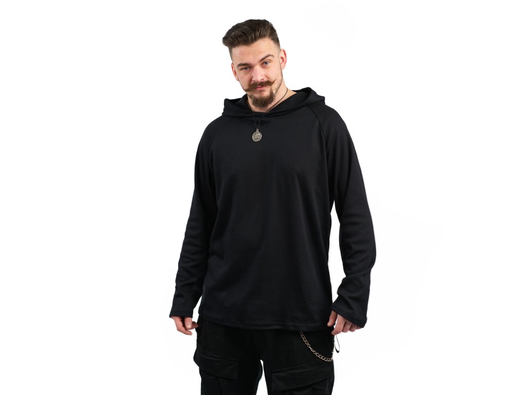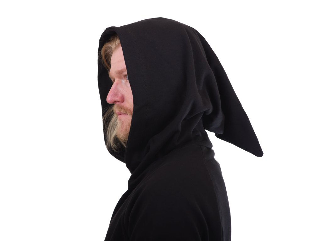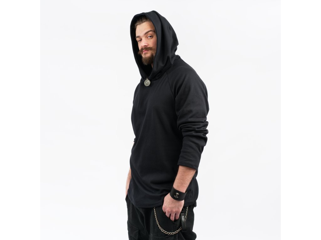 Mikina Skaven, to je originálny kúsok z našej dielne! Nenápadná a napriek tomu neprehliadnuteľná vďaka elegantnému strihu a špicatej kapucni. Mikina má dlhé raglánové rukávy, ktoré siahajú až do polovice dlaní, a širokú špicatú kapucňu, ktorá zakryje aj tú najhustejšiu šticu. Materiál je veľmi príjemný. Elegantný a pohodlný kúsok oblečenia v štýle tribal, ideálny nielen na zakrádanie nocí a sliedenie v tieňoch, ale aj na bežné nosenie.