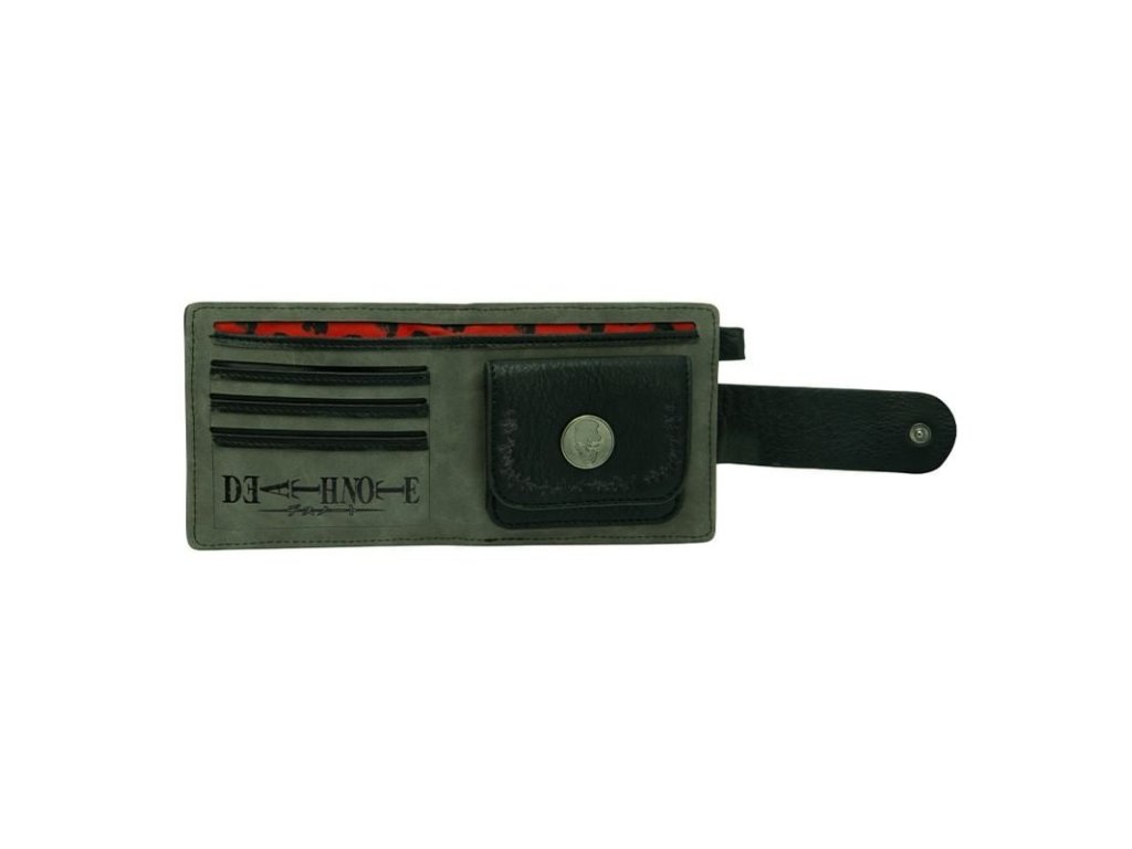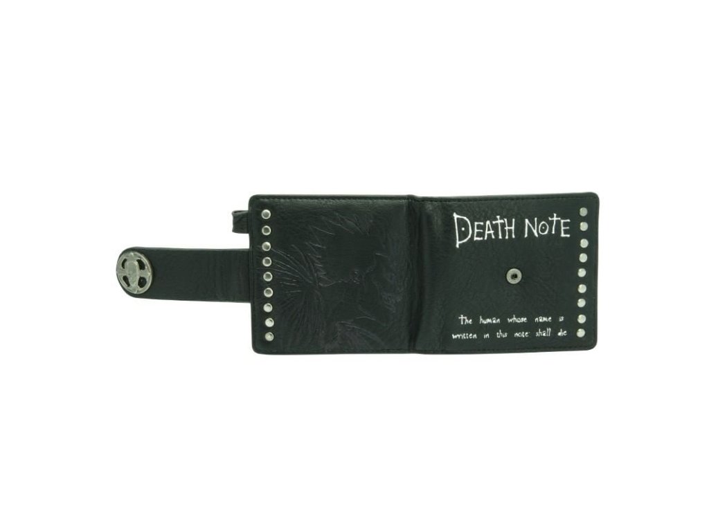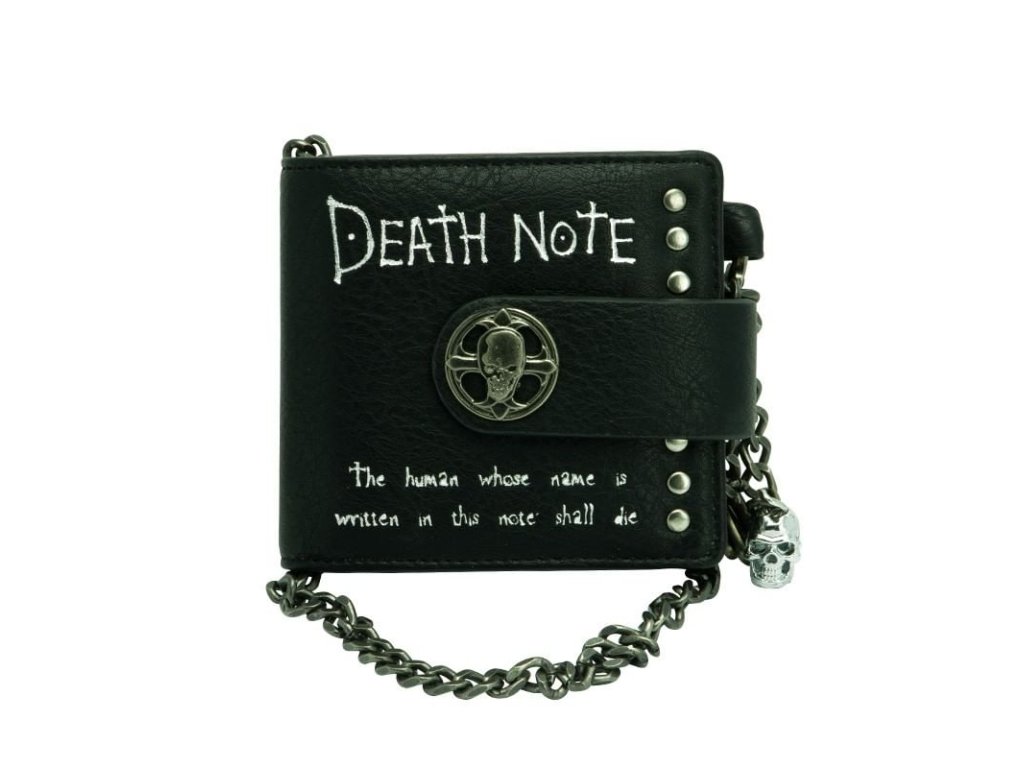 Jedinečná peňaženka pre všetkých fanúšikov japonskej mangy Zápisník smrti - Death Note má kovové zdobenie a zapínanie v podobe symbolu boha smrti Ryuka. Peňaženka ponúka svoje služby vašim platobným kartám, dokladom, vstupenkám či lístkom, nechýba zatváracie vrecko na drobné mince. Súčasťou je reťaz s karabínou dlhá 74 cm.