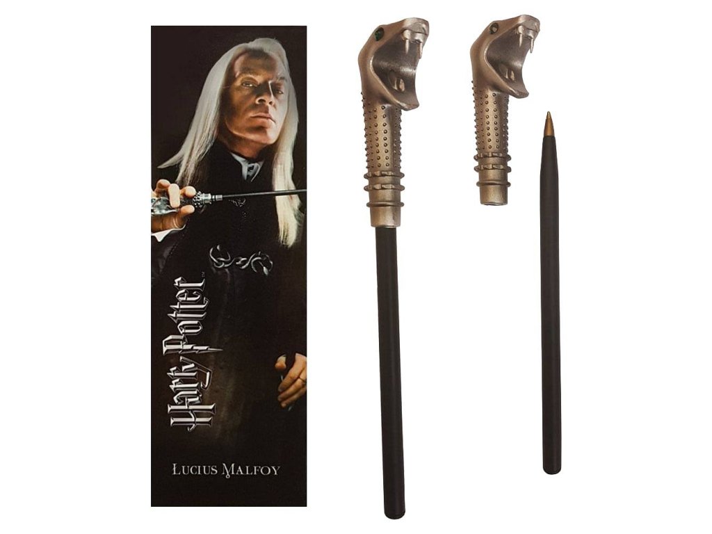 Stylová tužka v podobě kouzelnické hůlky Luciuse Malfoye a knižní záložka s motivem této postavy z filmů o Harry Potterovi.