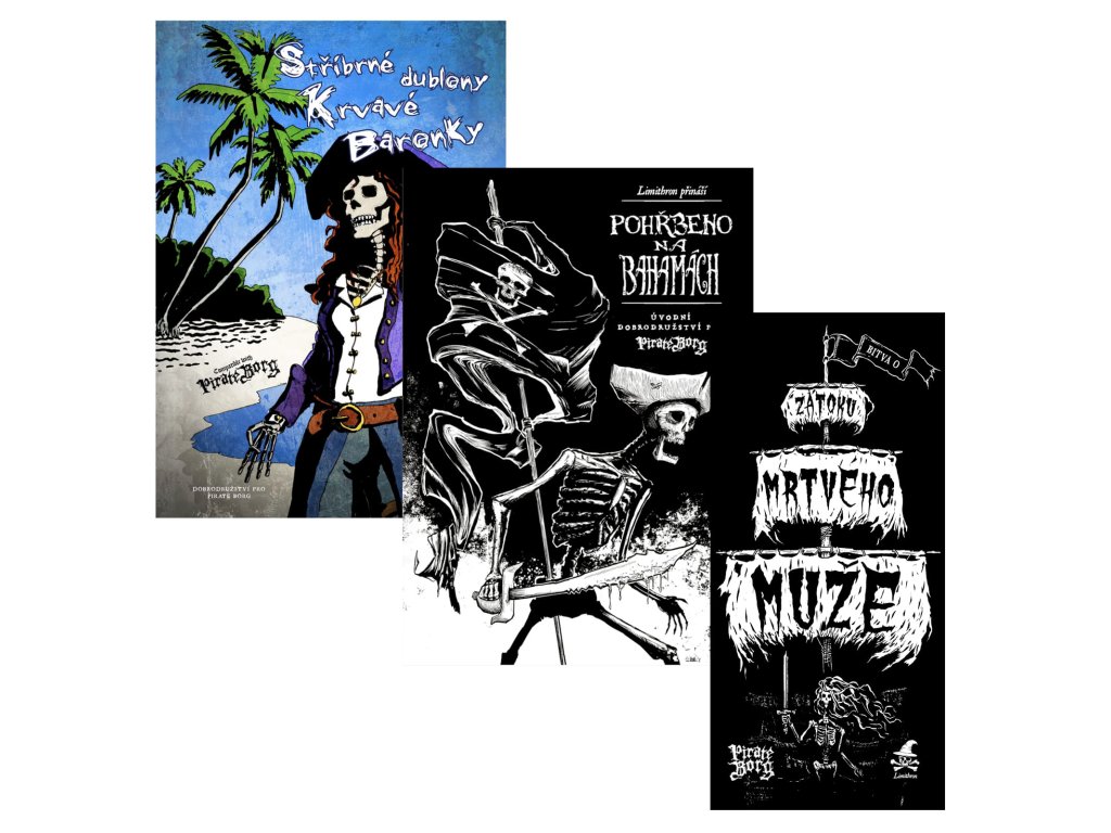 Hej, suchozemská kryso! Chceš zľavu, čo? Tak počúvaj. Mám tu pre teba balík, čo ti rozbúši srdce viac ako basa grogu! Tri príbehy z prehnitého a presoleného sveta Pirate Borg, a to všetko za pár zatratených dublonov! Najskôr sa pozeráš na Bahamách. Je to taká rýchlovka pre zelenáčov, čo sa ešte len učí držať kormidlo a nevypiť si mozog z hlavy. Rozhodni sa sám, či z toho bude len krátka mela, alebo začiatok poriadnej legendy! Potom ťa pošlem za pokladom samotný Krvavý Barónky! Čaká ťa prekliaty súostrovie plný kostlivcov, divných jašterov a ďalších bačudov, čo ti chcej podrezať krk pre pár strieborniakov. Ukradneš im ten poklad spod nosa, alebo skončíš ako potrava pre kraby? A keď budeš mať plný vrecka, je čas na poriadnu režbu v Zátoke mŕtveho! Ukážeš ostatným kapitánom, kto je tu pánom morí. Krátka, krvavá bitka, ktorá oddelí holobrádky od skutočných pirátov. Tak na čo čakáš? Chopte tento balík, alebo prisahám na svoju drevenú nohu, že skončíš v podpalubí s krysami! Toto je šanca, ako sa stať legendou.