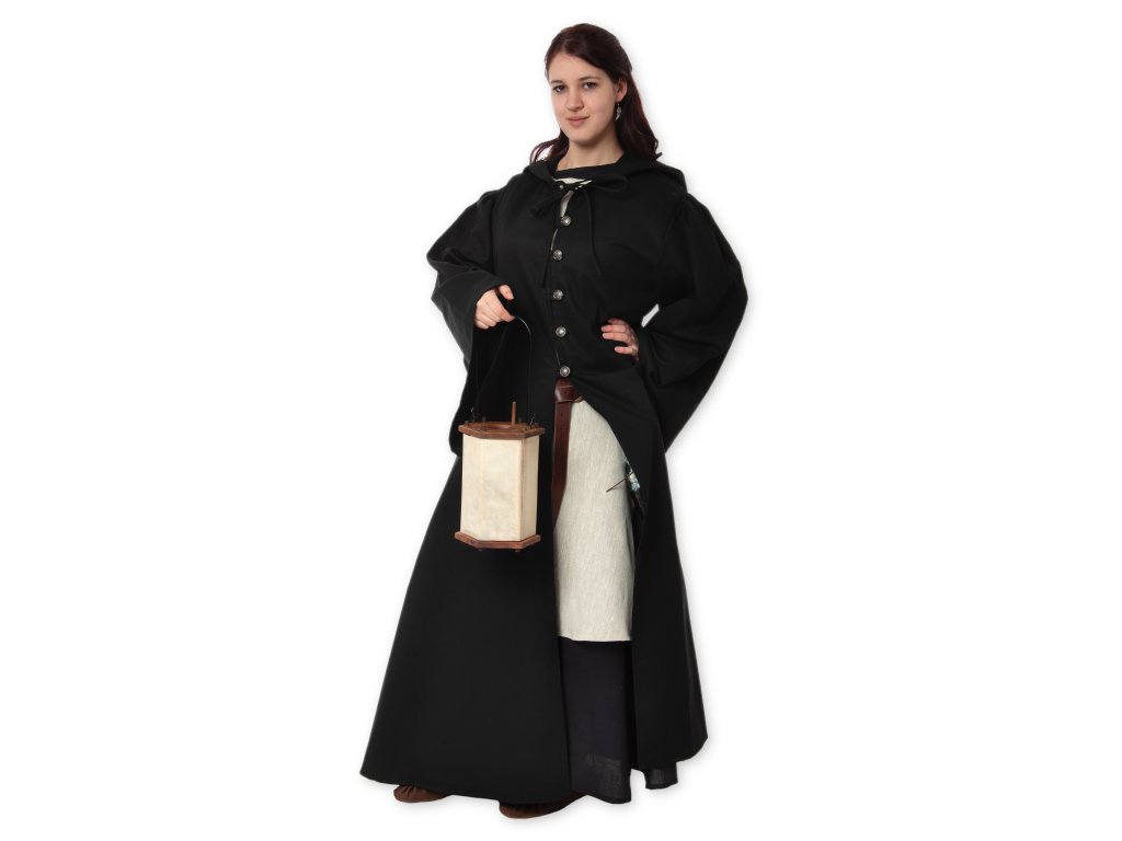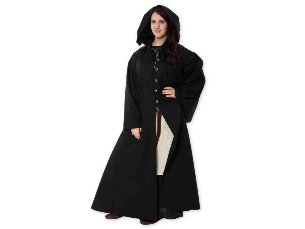 Široký dlouhý plášť z naší dílny. Má široké rukávy a velkou špičatou kapuci, zepředu se zapíná pěti knoflíky, většinou se přepásává páskem, ale je možné jej nosit i volně. V případě zájmu je možné plášť upravit dle Vašich požadavků - jiná barva, materiál, úprava rozměrů a různé další modifikace či doplňky. Stačí nám napsat do poznámky k objednávce. Více o použitém materiálu se dočtete zde: popis materiálů.