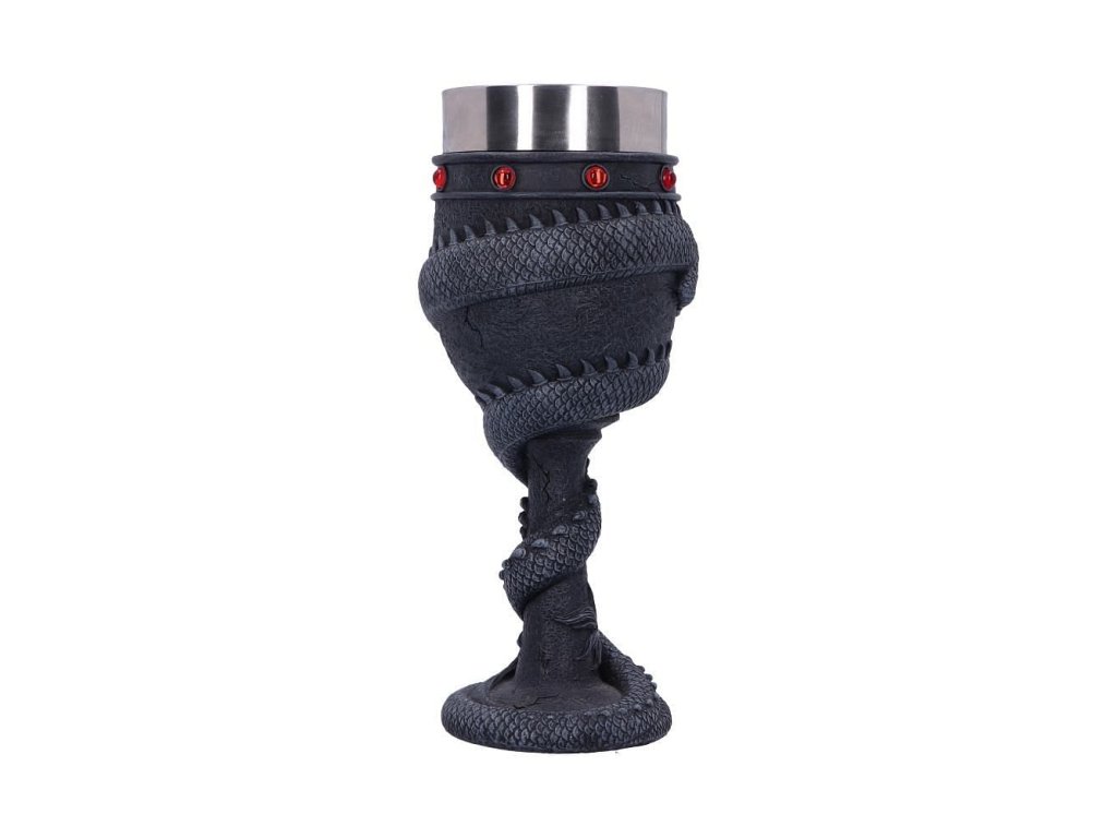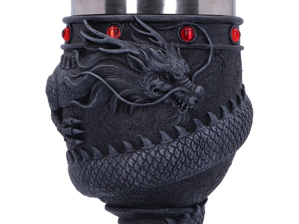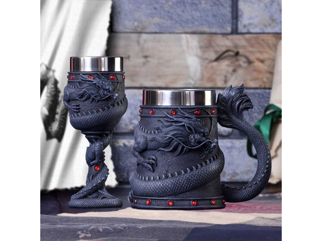 Pripite si z krásneho čierneho pohára, ktorý ovíja čierny čínsky drak, žiarlivo strážiaci svoje poklady! Pohár pre milovníkov drakov, fantastiky a mystiky bude jedinečným darčekom a skvelým doplnkom domácnosti a bude vám z neho chutiť vaše obľúbené víno alebo medovina. Pohár má v sebe vyberateľný nerezový insert, ktorý sa ľahko udržuje, vonkajšok je potom z resinu (syntetickej živice). Resinový pohár nie je vhodný do mikrovlnnej rúry ani umývačky riadu.
