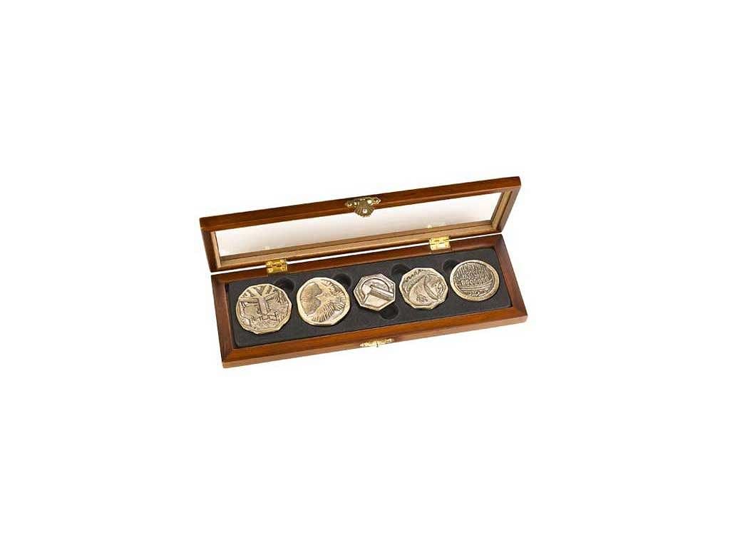 Autentická replika mincí z pokladu trpaslíkov - z filmového spracovania Tolkienova Hobita. Sada obsahuje päť mincí v drevenej výstavnej krabičke.