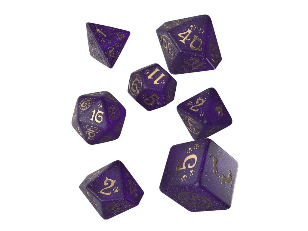 Originálna sada 7 mnohostenných mačacích kociek, inšpirovaných našimi chlpatými kamarátmi! Kocky sú vhodné pre hry na hrdinov aj doskové hry. Každú kocku trblietavo fialovej či hnedej farby zdobia jedinečné zlaté alebo biele symboly, ako sú napr. labky, miska na jedlo alebo klbko. Sada obsahuje štyroch, šiestich, ôsmich, desiatich, dvanástich, dvadsiatich stennú a percentovú kocku. Purrito verzia je fialovo-zlatá. Muffin verzia je karamelovo-biela. Pixel verzia zelená. Kocky boli vyrobené na základe licencie udelenej mačacím odtlačkom labky na príslušnom právnom dokumente.