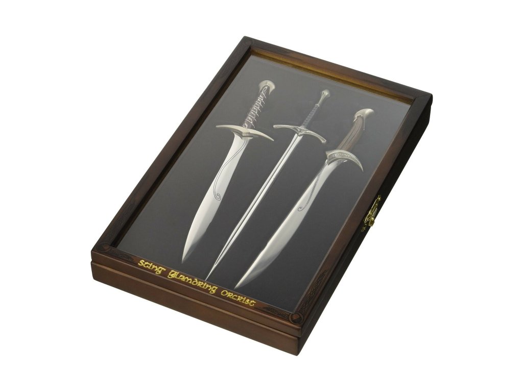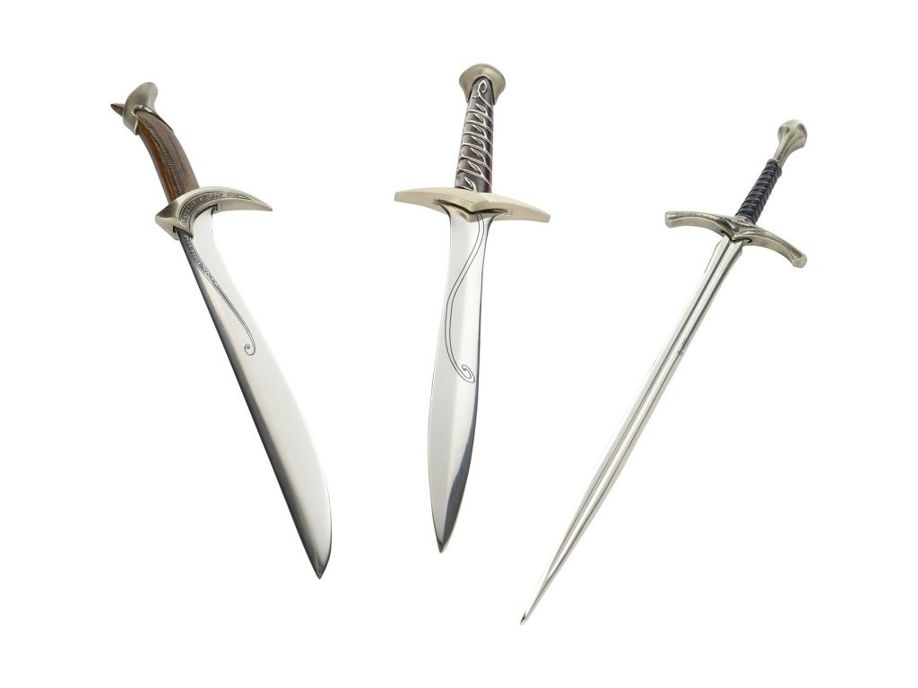 Súprava troch nožov na listy v podobe elfských mečov z filmového spracovania Tolkienova Hobita.