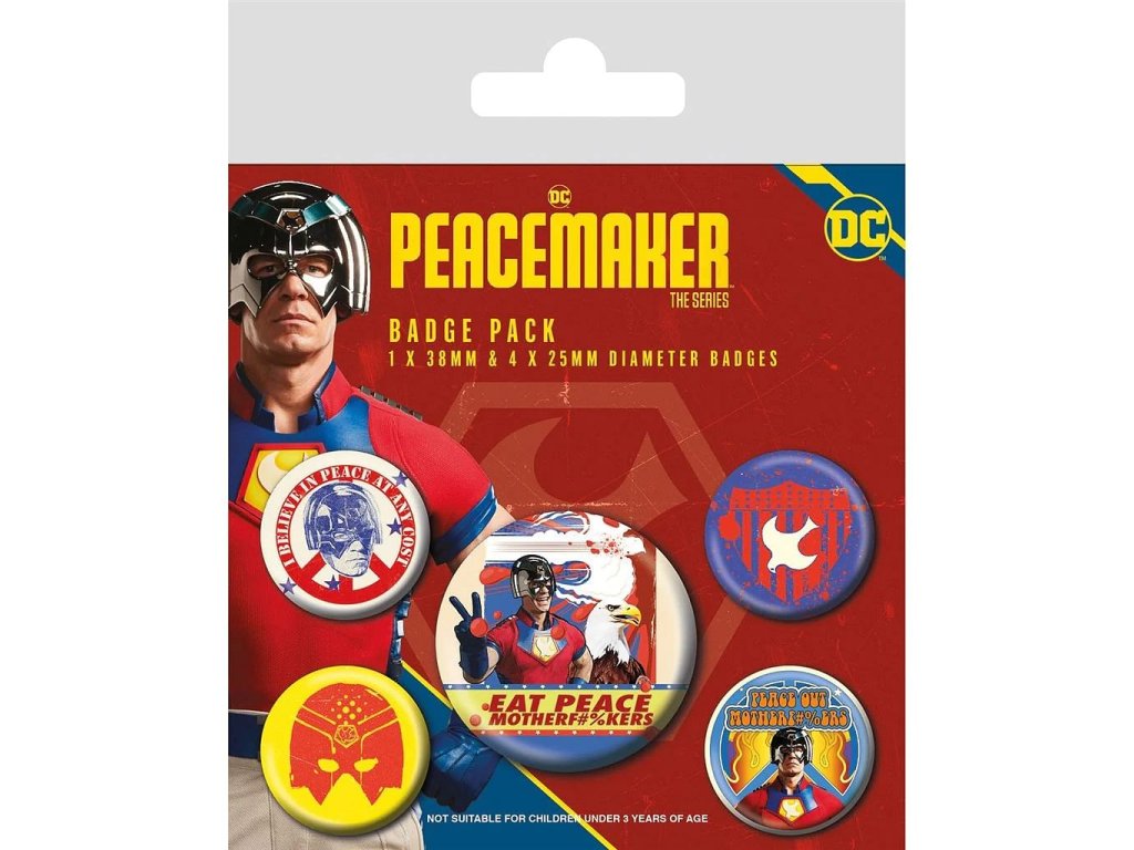 Sada obsahuje 5 okrúhlych odznakov s motívmi seriálového Peacemakera od DC Comics. V balení nájdete 1 väčšiu placku s priemerom 3,8 cm a 4 menšiu s priemerom 2,5 cm.