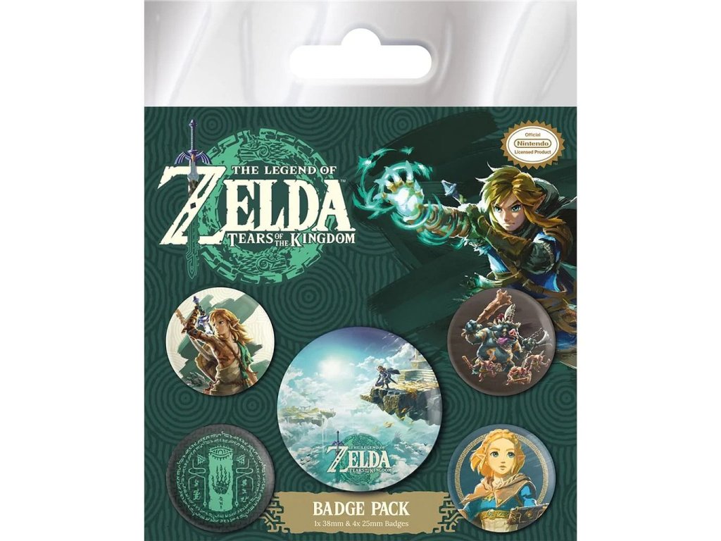 Súprava obsahuje 5 okrúhlych odznakov s grafikou obľúbenej videohry The Legend of Zelda: Tears of the Kingdom (Hyrule Skies). V balení nájdete jednu placku s priemerom 3,8 cm a štyri placky s priemerom 2,5 cm.