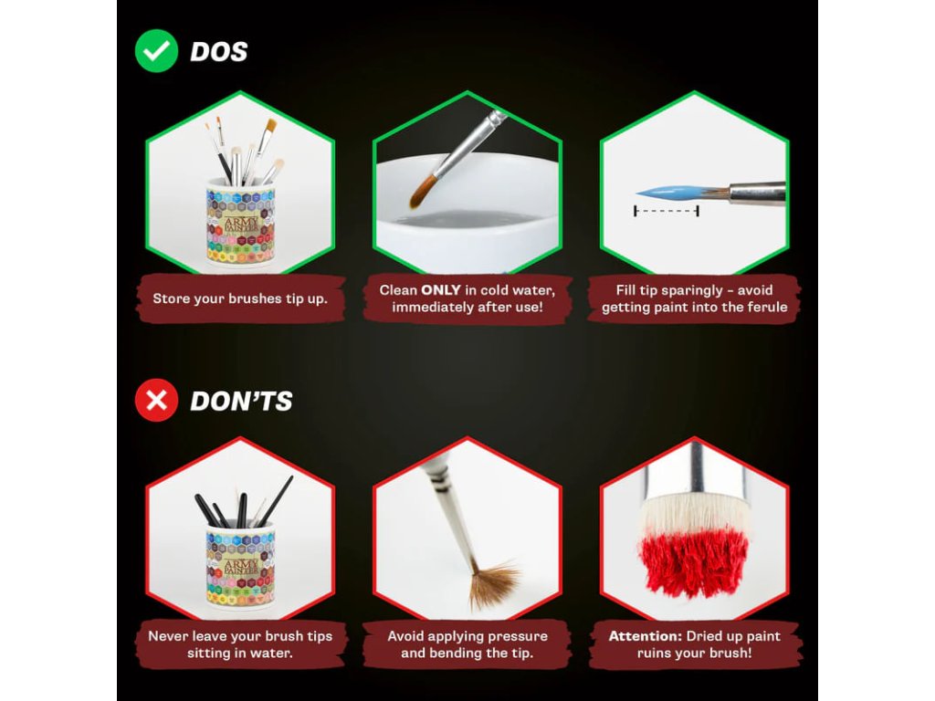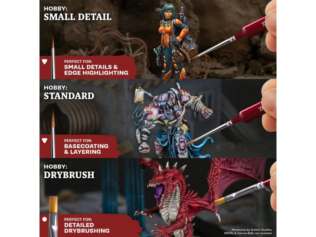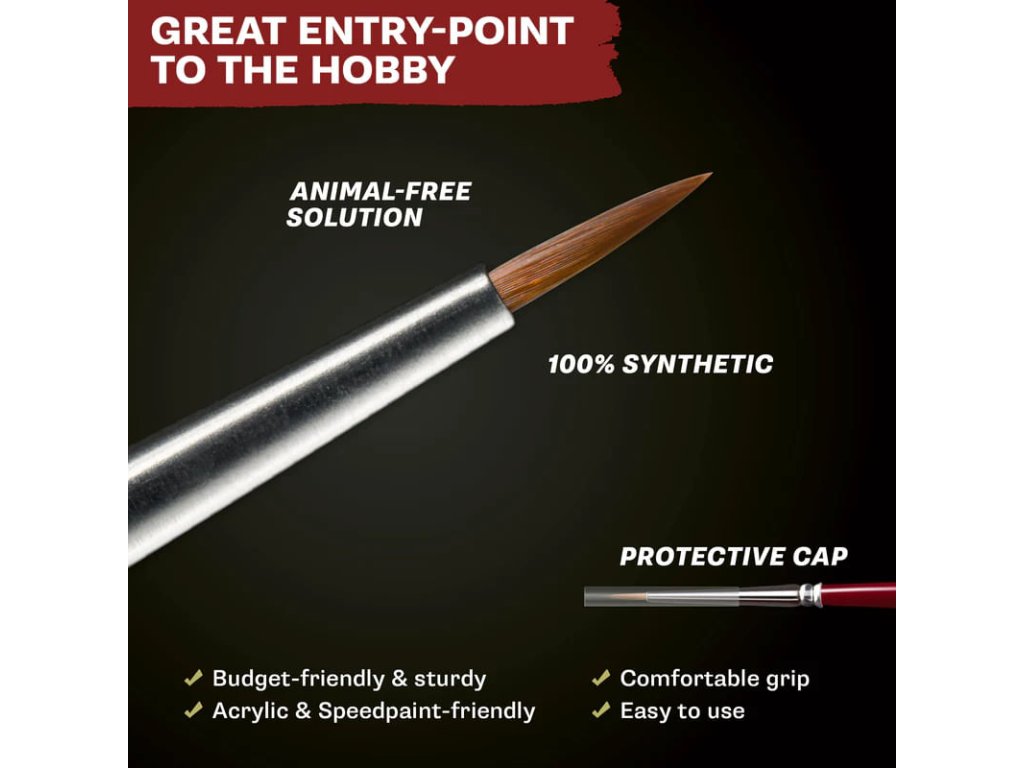 Hobby Starter Brush Set od The Army Painter – je sada, ktorá ti poskytne všetko potrebné na precízne a pohodlné maľovanie miniatúr. 3 starostlivo vybrané štetce pokrývajú všetky fázy maľovania – od základných vrstiev až po jemné detaily a efektné zvýraznenie. So štetcom Standard zvládneš rýchlo a hladko nanášať základné farby. Má ideálnu veľkosť aj tuhosť štetín a vďaka ergonomickej trojuholníkovej rukoväti skvele padne do ruky! Pre tie najjemnejšie časti modelu je tu Small Detail štetec. Jeho ultrajemný hrot ti umožní s úplnou presnosťou maľovať oči, lemovanie alebo drobné ozdoby. Drybrush štetec s plochou hlavou a hrubšími štetinami je ideálny pre techniku suchého štetca. Ľahko s ním zvýrazníš hrany, vytvoríš efekty opotrebenia alebo textúrované detaily, ktoré model oživia behom pár sekúnd.