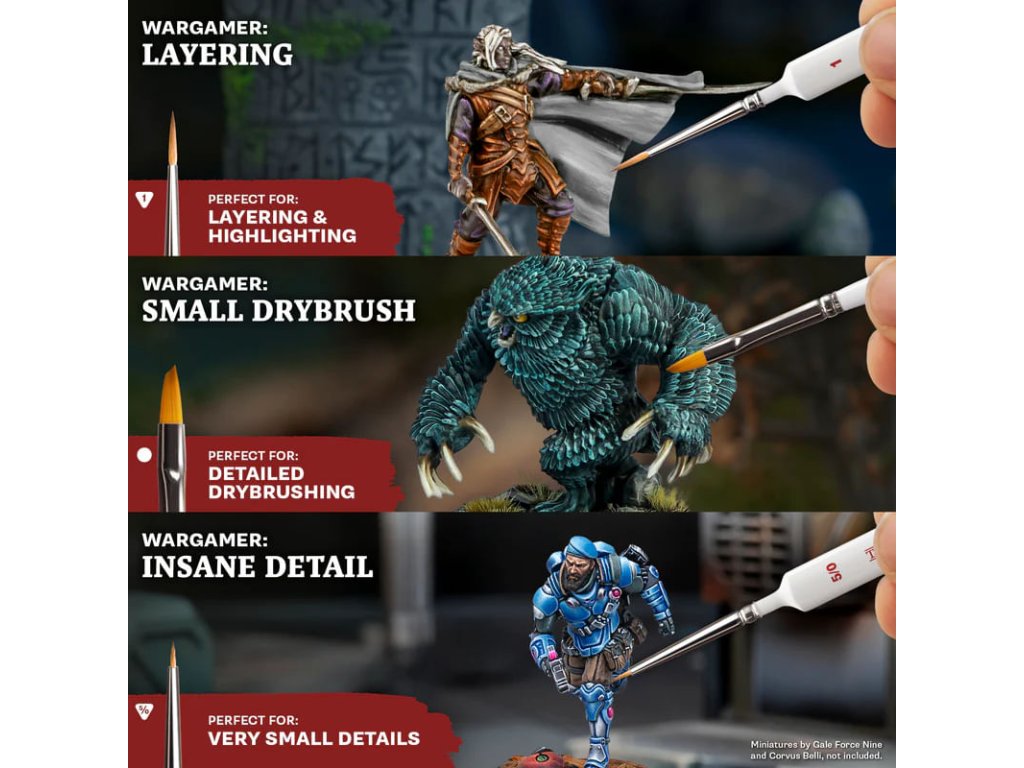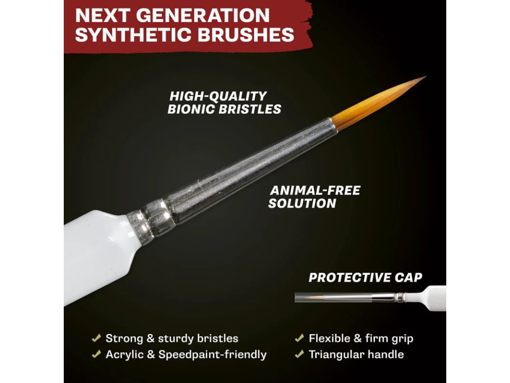 Most Wanted Brush Set od Army Painter je sada štetcov, ktoré potrebuješ na dokonalý základný náter, vrstvenie a zvýraznenie miniatúr. V sade nájdeš: Layering štetec (veľ. 1) s Bionic štetinami, ideálny na hladké vrstvenie a budovanie farebných prechodov na miniatúrach. S týmto štetcom zvládneš nanášať farbu plnými, rovnomernými ťahmi a získať perfektné výsledky. Pre jemné detaily je tu legendárna Insane Detail štetec (Size 5/0 mm) s Bionic štetinami – historicky najpredávanejší štetec Army Painter. Je ideálny na maľovanie drobných častí ako sú zbrane, šupiny monštier, nity alebo iné mini detailné prvky. Štetec Small Drybrush so skoseným rezom 43 ° a syntetickými štetinami, ktorý je perfektný pre techniku suchého štetca. Skvele zvýrazní malé časti miniatúr, napríklad reťazovú zbroj, zbrane alebo iné vyvýšené detaily. Táto sada je perfektnou voľbou pre začiatočníkov i skúsených maliarov, ktorí chcú posunúť svoje miniatúry na profesionálnu úroveň!