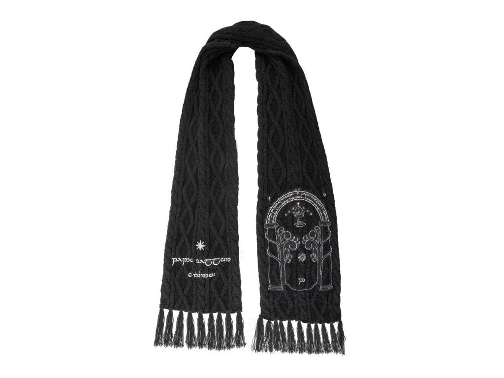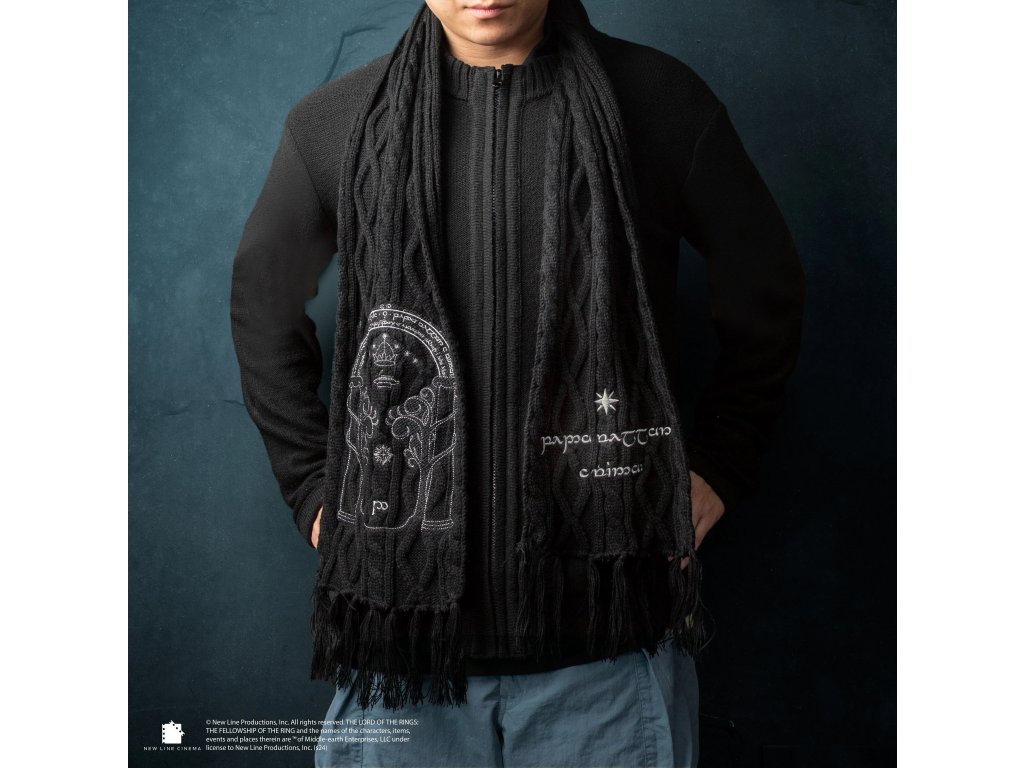 Vydaj sa na výpravu do Hmlistých hôr! A nezabudni - mama mala pravdu, poriadny šál je základ každej výpravy. Teplý šál v elegantnej čiernej farbe o veľkosti 170 x 20cm, zdobený symbolom brány do Morie - trpasličieho mesta, kde sa ťažil veľmi vzácny kov mithril. Perfektný darček pre tvojho kamaráta, ktorý zbožňuje svet Pána prsteňov. Práve slovo Priateľ otvorilo bránu k úžasnému dobrodružstvu. Či už čelíš mrazivému počasiu Caradhrasu, alebo len kráčaš po lesnom chodníku, budeš mať kúsok Stredozeme vždy pri sebe!