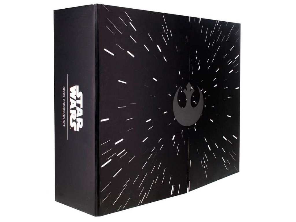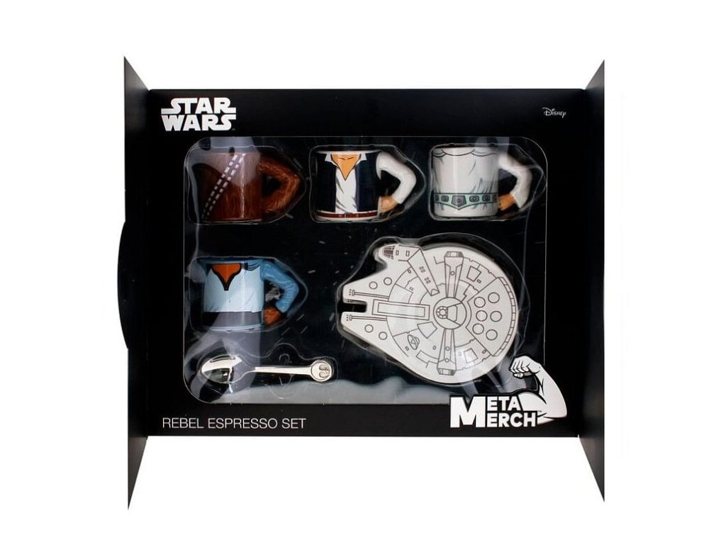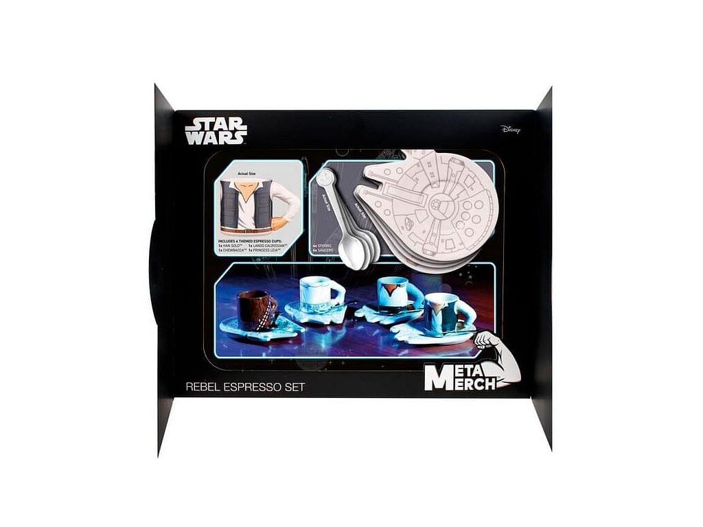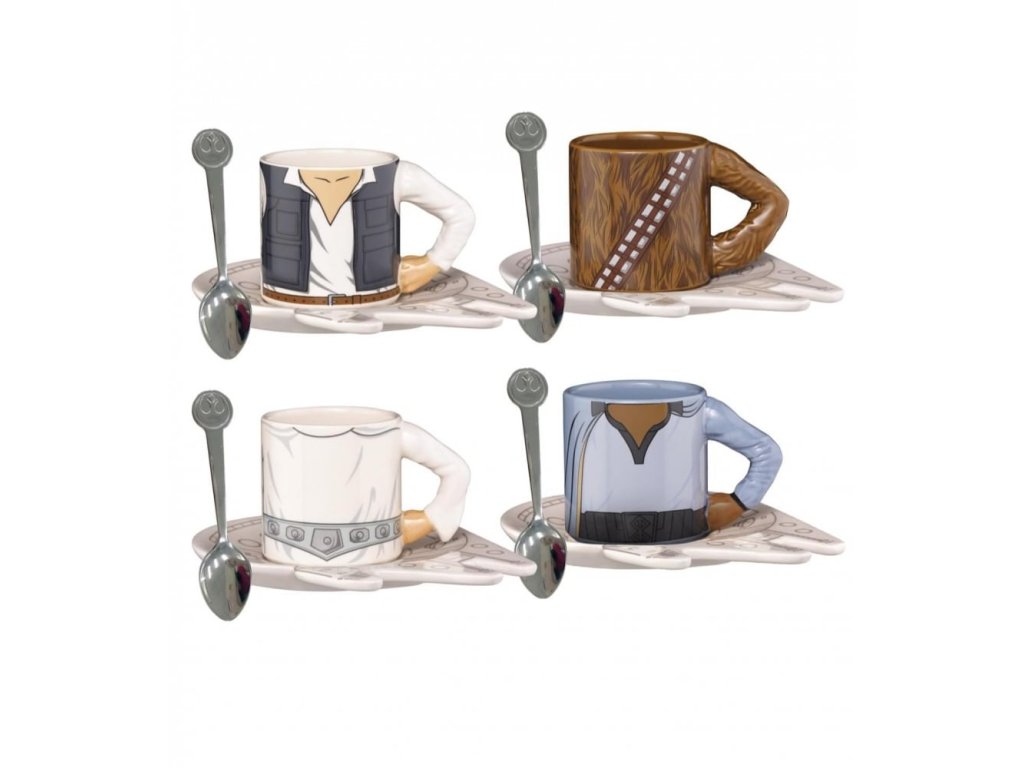Originálna sada na espresso pre milovníkov Star Wars - Hviezdnych vojen obsahuje 4 štýlové hrnčeky s grafikou Hana Sola, Žvejkala, princeznej Leiy Organy a Luka Skywalkera. Súčasťou sú aj 4 tanieriky v tvare slávnej lode Millennium Falcon a 4 kovové lyžičky so znakom povstalcov. Krásny darček pre fanúšikov slávnej sci-fi ságy!