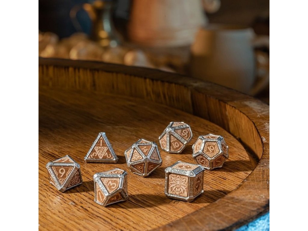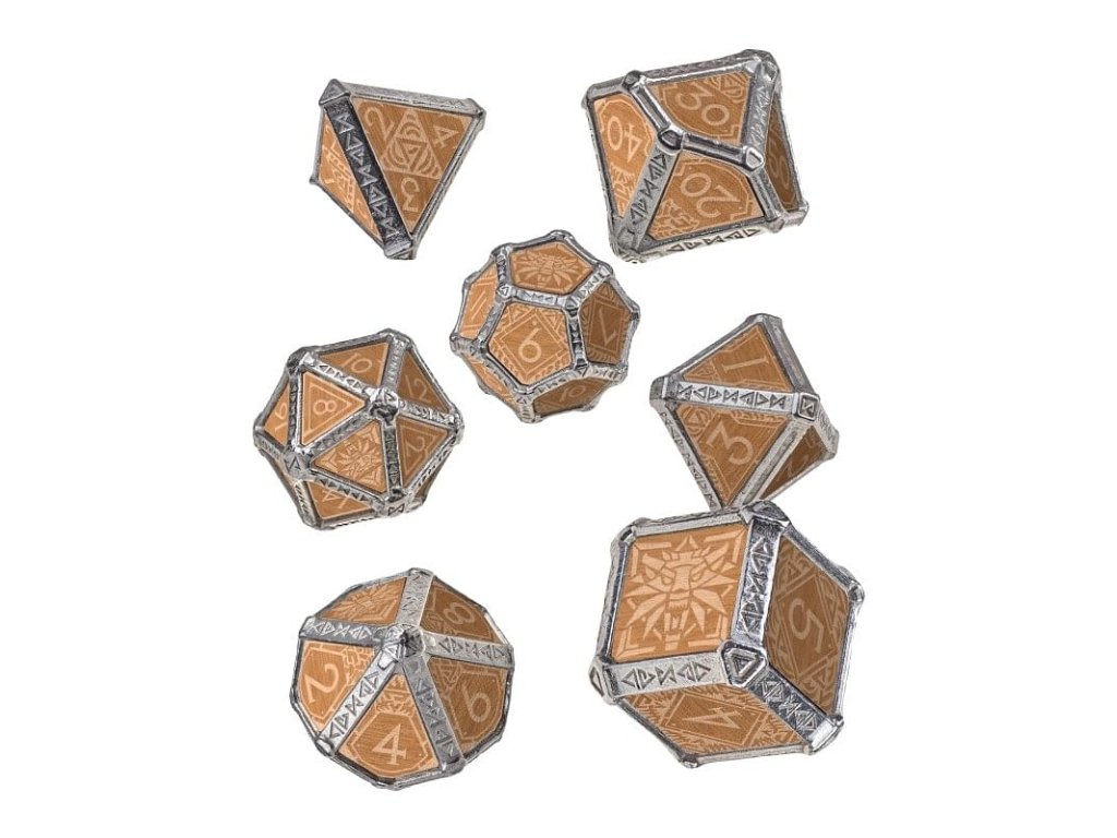 Súprava jedinečných hybridných kociek pre zaklínačov v sebe kombinuje kov a drevo. Kocky zdobí symbolika zaklínačských znamení, namiesto najvyššej hodnoty je vždy symbol školy Vlka. S týmito jedinečnými kockami bude každý hod skutočným pôžitkom. Balenie obsahuje 1x štyroch, 1x šiestich, 1x ôsmich, 1x desiatich, 1x dvanástich, 1x dvadsiatich stennú a 1x percentovú kocku.