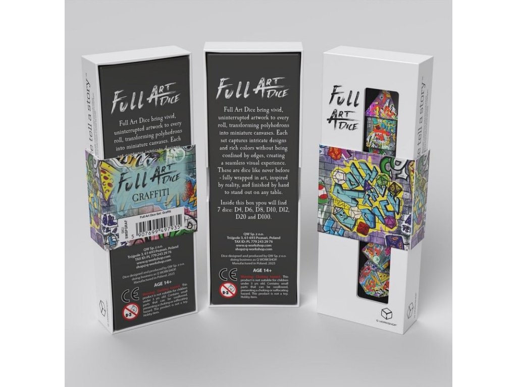 Táto sada nezapadá do šedi. Každá kocka vyzerá ako kus street artu, ktorý práve ožil. Farebné spreje, neónové ťahy a vrstvy výrazných textúr sa prelínajú naprieč všetkými hranami. Full Art Dice Set – Graffity je poctou rebéliou, kreativite a osobitému štýlu – ideálny pre hráčov, ktorí chcú, aby ich kocky boli rovnako hlasné ako ich ťahy. Vďaka novej full-color technológii sa design prelieva hladko z jednej strany na druhú, bez prerušenia, ako keď sa farba rozteká po stene. Runové číslice sú ale stále jasné a čitateľné, aby ťa nič nerušilo pri hre. Vnútri sady nájdeš 7 polyedrických kociek (k4, k6, k8, k10, k%, k12 a k20), ktoré spájajú výtvarný dojem s hernou funkčnosťou. Pokiaľ chceš, aby každé hod kockou pripomínal výbuch kreativity, si tu správne.
