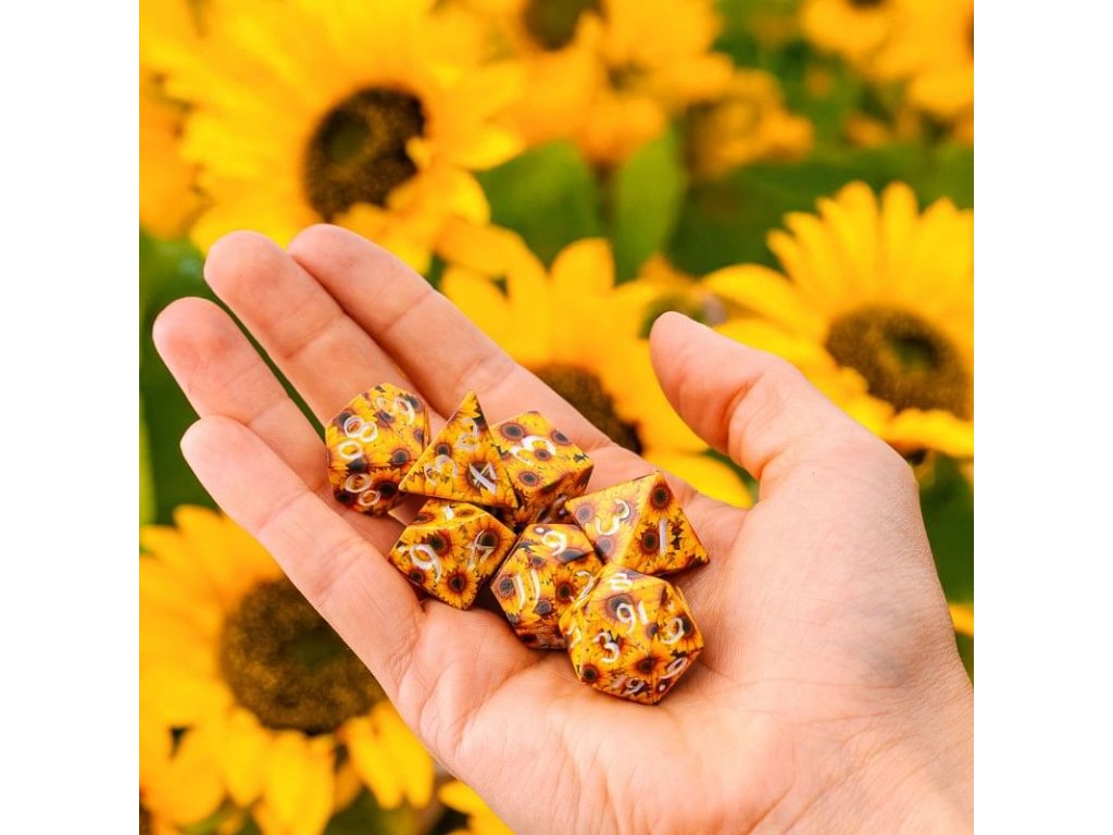 Existujú miesta, kde slnko nikdy nezapadá - a práve tak pôsobí táto sada. Každá kocka je malým okienkom do večného leta, kde zlaté slnečnice rozkvitajú na všetkých stranách. Okvetné lístky pretekajú cez hrany, spájajú sa do živého vzoru a vytvárajú dojem, ako by si držal v ruke krajinu zaliatu svetlom. Full-art technológia prináša plynulú, realistickú tlač bez prerušenia medzi stenami. Každý detail je vyladený do posledného listu – a pritom čísla zostávajú jasné vďaka kontrastnému runovému fontu. V krabičke nájdeš 7 polyedrických kociek (k4, k6, k8, k10, k%, k12 a k20), ktoré sú nielen krásne, ale aj herne spoľahlivé. Sú vyvážené, odolné a pripravené na intenzívne hranie aj obdiv. Či už si hráč, zberateľ alebo milovník slnečných motívov, táto sada ti pripomenie, že aj hod môže byť malým umeleckým zážitkom.