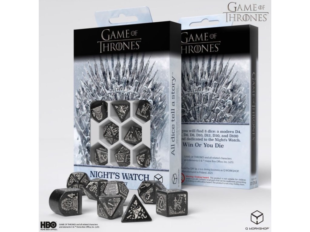 Táto oficiálne licencovaná sada kostiek vzdáva poctu Nočnej hliadke - bratom v čiernom, ktorý stojí medzi svetom živých a temnotou na severe. Kocky v temne třpytivej čiernej farbe so strieborným rytím pripomínajú zimnú noc a chlad kameňa na Múre. Kocky zdobia havranmi krúžiace nad táborom, pochodne v temnote a prísaha, ktorá sa ozýva v každom hode - „Sword in the Darkness.“ Vnútri nájdeš kompletnú sadu 7 kostiek (k4, k6, k8, k10, k%, k12 a k20)