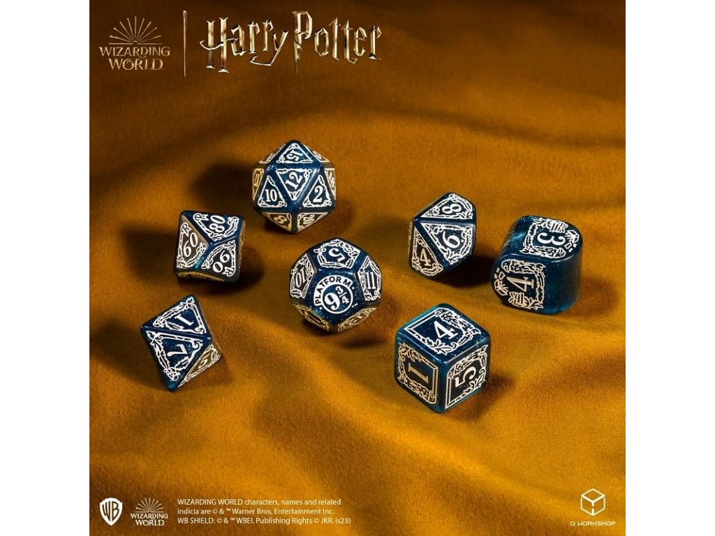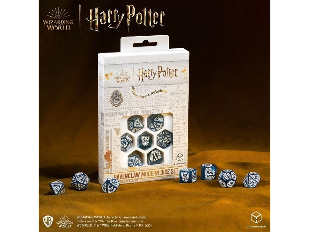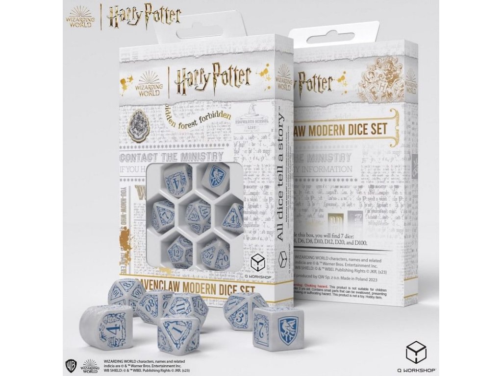 Sada obsahuje 7 mnohostenných kociek v grafike bradavickej koľaje Bystrohlav z príbehov o Harrym Potterovi. Originálne kocky pre hry na hrdinov - nielen z magického sveta J. K. Rowlingovej! V ponuke máme 2 rôzne farebné varianty kociek: modro-bielu a bielo-modrú. Balenie obsahuje 1x štyroch, 1x šiestich, 1x ôsmich, 1x desiatich, 1x dvanástich, 1x dvadsiatich stennú a 1x percentovú kocku.
