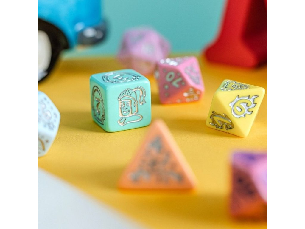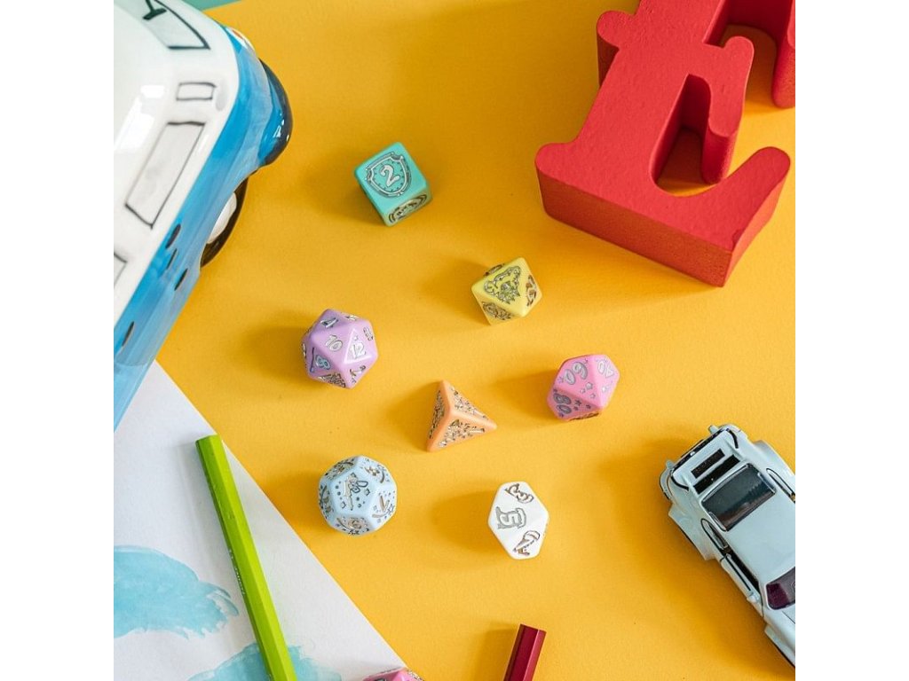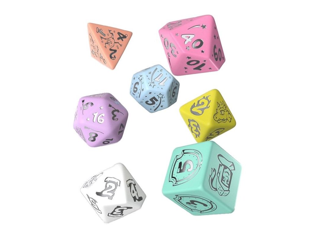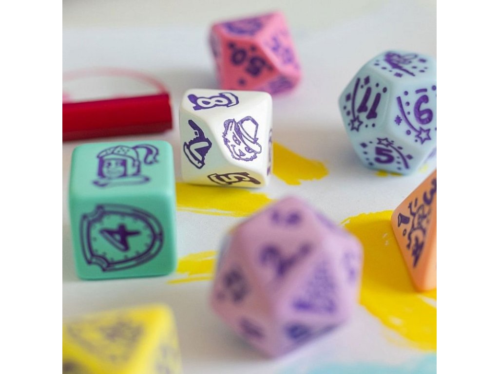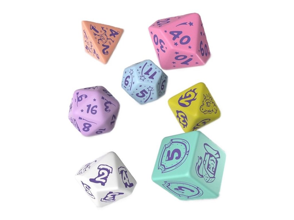 Súprava kociek My Very First Set je vhodná pre najmenších hráčov a obsahuje 7 rôznostranných kociek v pastelových farbách, na ktorých okrem čísel nájdete obrázky ako sú napríklad žabí princ, jednorožec alebo drak. Hoďte kostkami a skúste rozprávať svoj vlastný pohádkový príbeh! Balenie obsahuje štyri, šesť, osem, desať, dvanásť, dvadsiatich stennú a percentovú kostku. Dva varianty sa líšia v farbe čísel a obrázkov - sú fialové alebo strieborné.