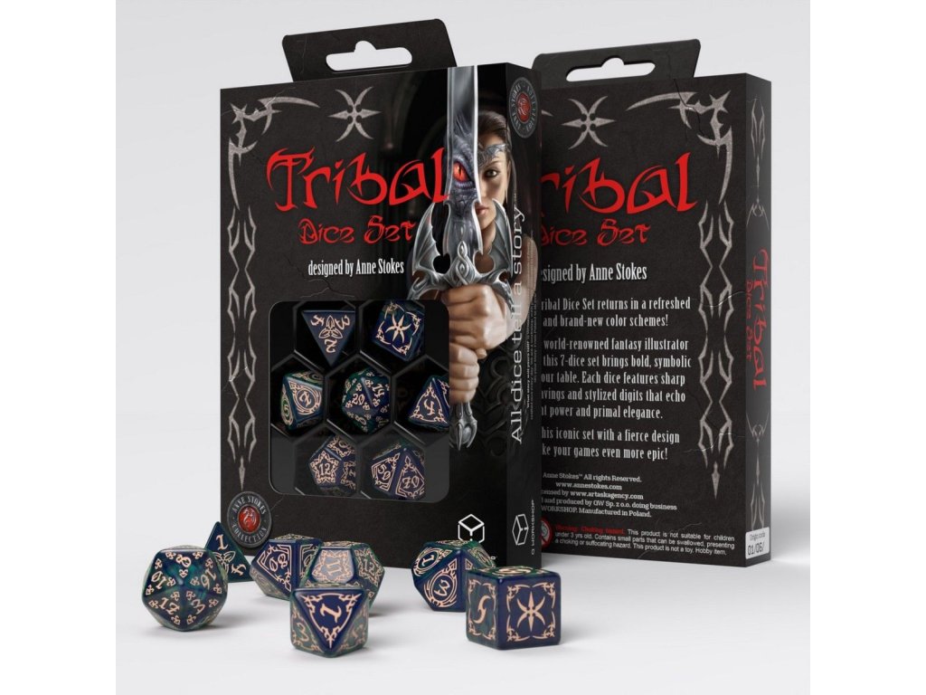 Sada Duchové more má v sebe pradávnu silu a mágiu morských hlbín. Je navrhnutá svetoznámou ilustrátorkou Anne Stokes, kombinuje žiarivé modrozelené tóny s teplou béžovou a vytvára tak tajomnú atmosféru starých kmeňových rituálov. Vďaka jemnému lesku a plynulému prechodu farieb pôsobí každá kocka ako artefakt stratený časom – pripravený stať sa súčasťou tvojho dobrodružstva. Vnútri nájdeš kompletnú sadu 7 kociek (k4, k6, k8, k10, k%, k12 a k20).