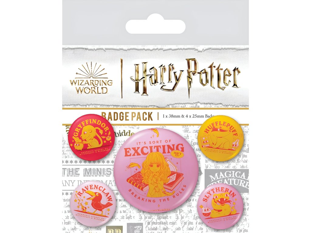 V sade nájdeš 5 okrúhlych odznakov s pastelovými motívmi z Harryho Pottera. Na plackách nájdeš Hermionu a štvoricu slávnych bradavických koľají - Chrabromil, Bystrohlav, Slizolin a Bifľomor. Ozdôb si svoj batoh alebo oblečenie a štýlovo vyraz do školy čiar a kúziel! Balenie obsahuje 4 placky s priemerom 2,5 cm a 1 placku s priemerom 3,8 cm.