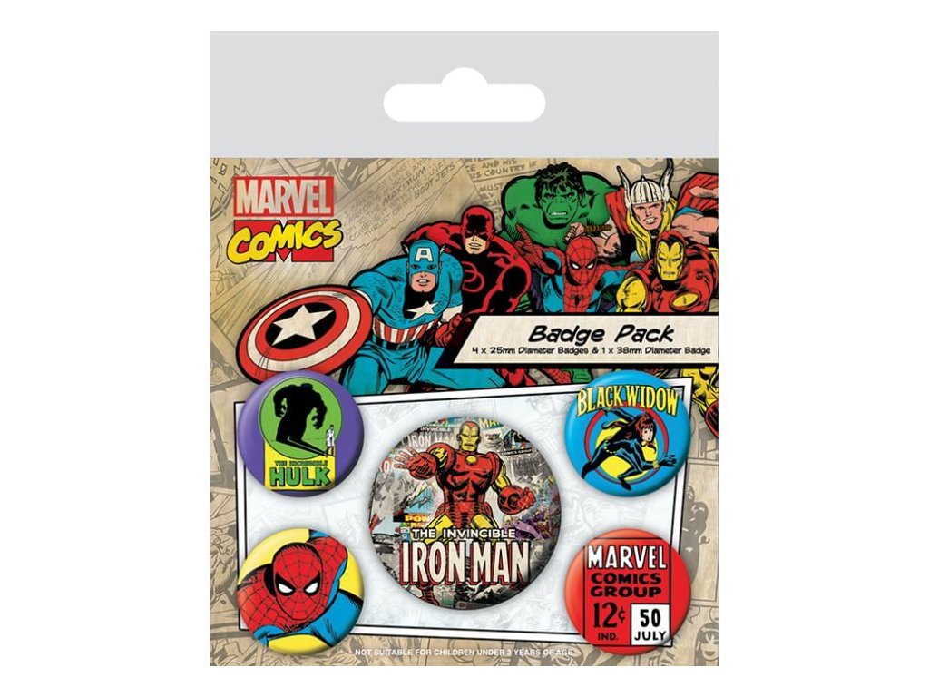 Súprava obsahuje 5 ks okrúhlych odznakov s obrázkami superhrdinov z komiksov od Marvelu - s Iron Manom, Hulkom, Black Widow či Spider-manom.
