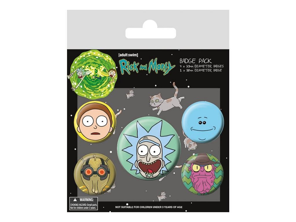 Sada obsahuje 5 okrúhlych odznakov (4 menšie a 1 väčšie) s obrázkami portálu a hláv hrdinov z obľúbeného amerického humorného animovaného seriálu Rick and Morty.